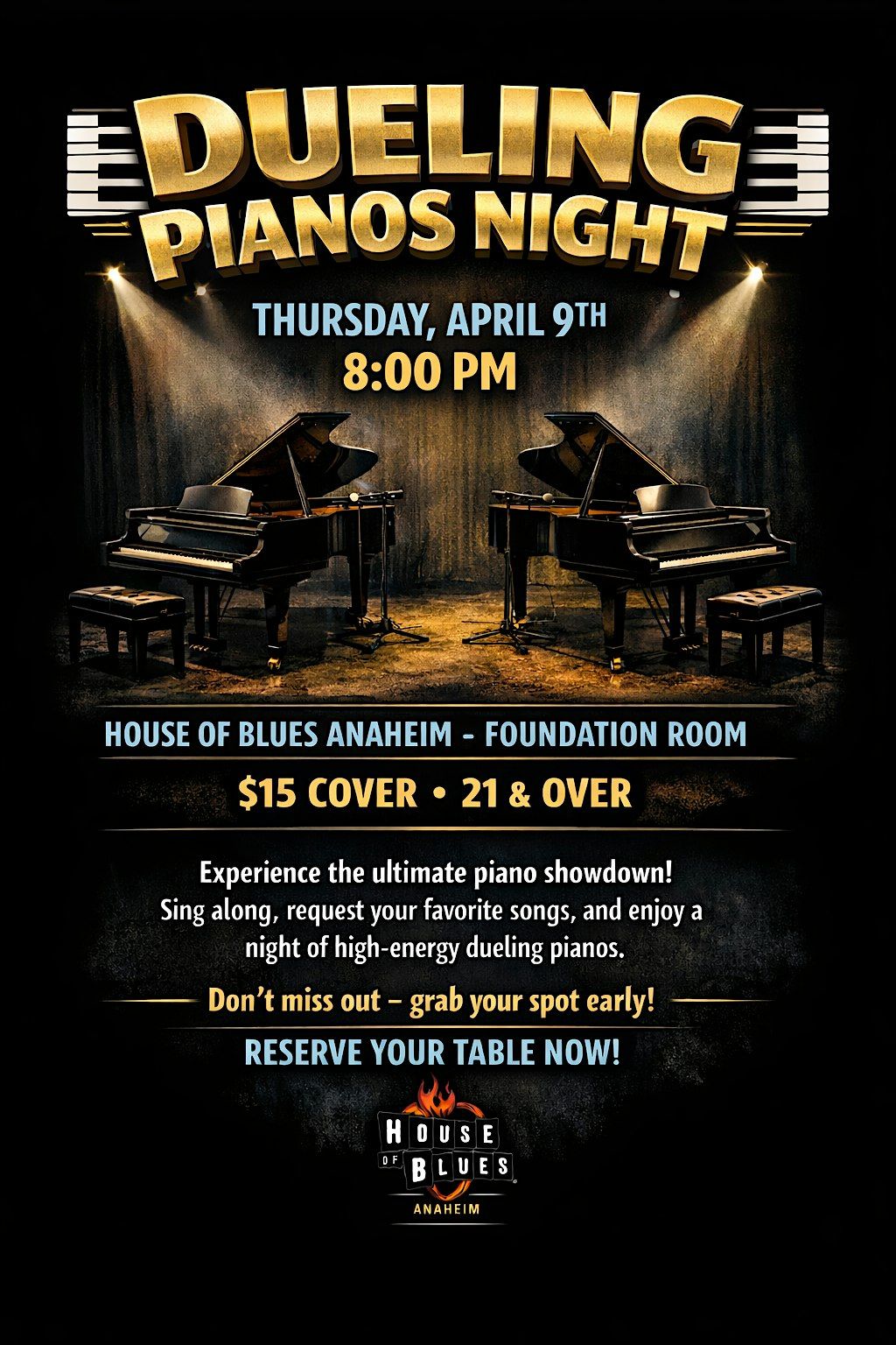 Get ready for an epic night of music and fun! Join us in person as talented pianists go head-to-head, creating an unforgettable interactive show. Whether you're a music lover or just looking for a great time, Dueling Pianos LIVE at the House of Blues Anaheim is where you want to be. Sing along, request your favorite tunes, and soak up the lively atmosphere in the cozy Foundation Room. Don’t miss out on this electrifying experience!