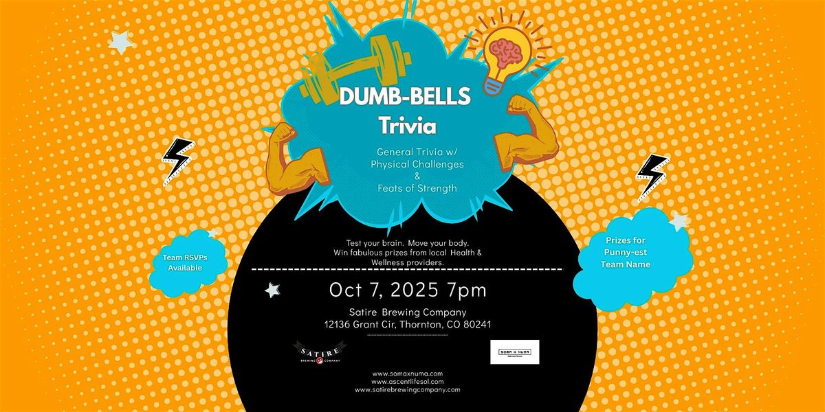 Join us and the gang at Satire Brewing Company for this unique twist on pub trivia. DUMB-BELLS is pub trivia with a health and wellness twist. Win prizes by answering questions and competing against other teams with fun, no-intensity physical challenges and feats of strength. You will feel smarter and more fit after you play. Come, play, drink some beer, and win prizes from local health and wellness providers. Free to play!