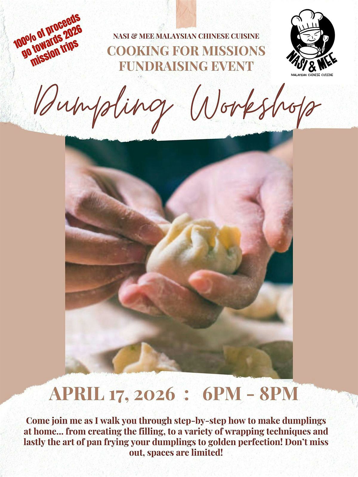 Come join me as I walk you through step-by-step how to make pork and veggie dumplings at home (vegan option available upon request)... from creating the filling, to a variety of wrapping techniques and lastly the art of pan frying your dumplings to golden perfection! Don't miss out, spaces are limited!