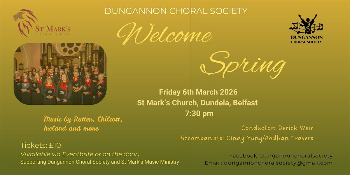 Join us for the Welcome Spring Concert, a joyous event filled with beautiful voices and uplifting melodies. It's the perfect way to celebrate the season and enjoy some fantastic choral music. Bring your friends and family, and let's welcome spring together! Refreshments will be served after the concert. Funds from the event will support Dungannon Choral Society and St Mark's Music Ministry.
