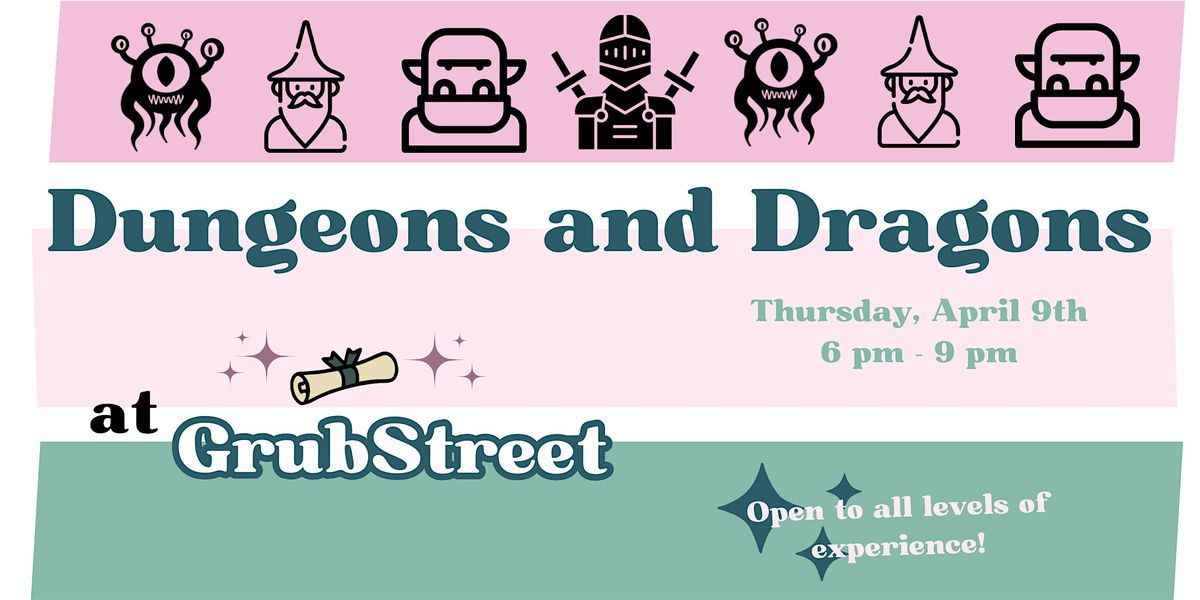 Fight The Exposition presents Dungeons and Dragons (D&D) night at GrubStreet! Come join us for a night of adventure as we explore the fantastical realm of sword and sorcery, battle epic monsters, and uncover secrets that have been locked away for centuries. Open to all levels of experience, seats are limited so don't miss out on what will be a very exciting night!