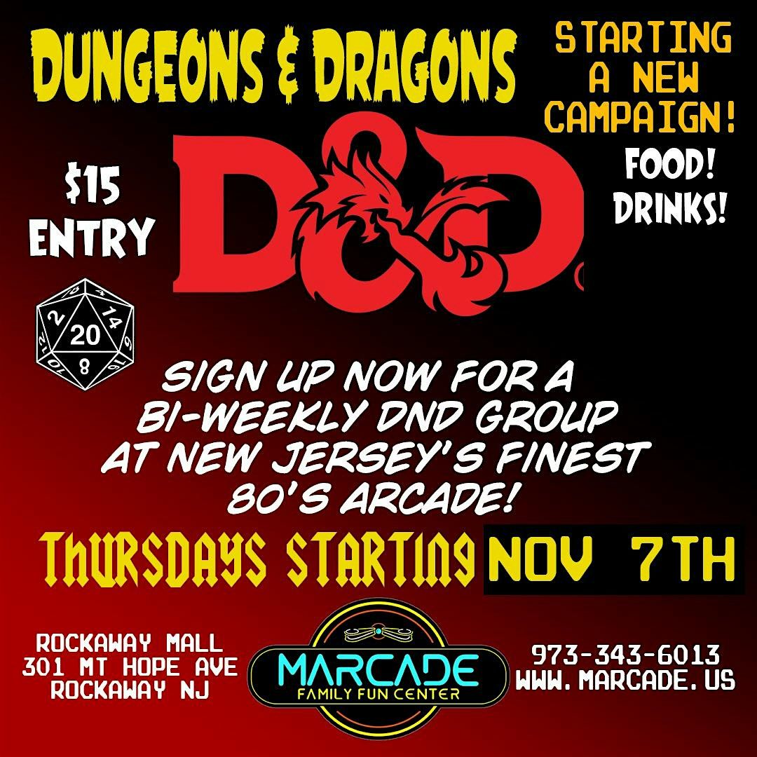 Start a new DnD campaign with your arcade buddies! This is an experienced level, new campaign kicking off in our private room here at Marcade Mall! Starting Nov 1st our "Dungeon Master" will be launching a new campaign so we're seeking campaigners! On top of that the there will be food and refreshments in our gaming area! Cost of admission also covers unlimited gaming in our awesome 80s arcade on the day of the event! What a killer way to spend Thursday nights!