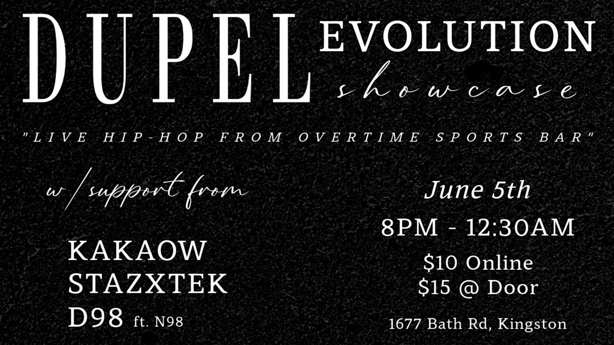 Following up on his recent regional tour, Dupel hits the stage at the legendary Overtime Sports Bar in Kingston for a showcase of some of his best work and fan favourites through the years.