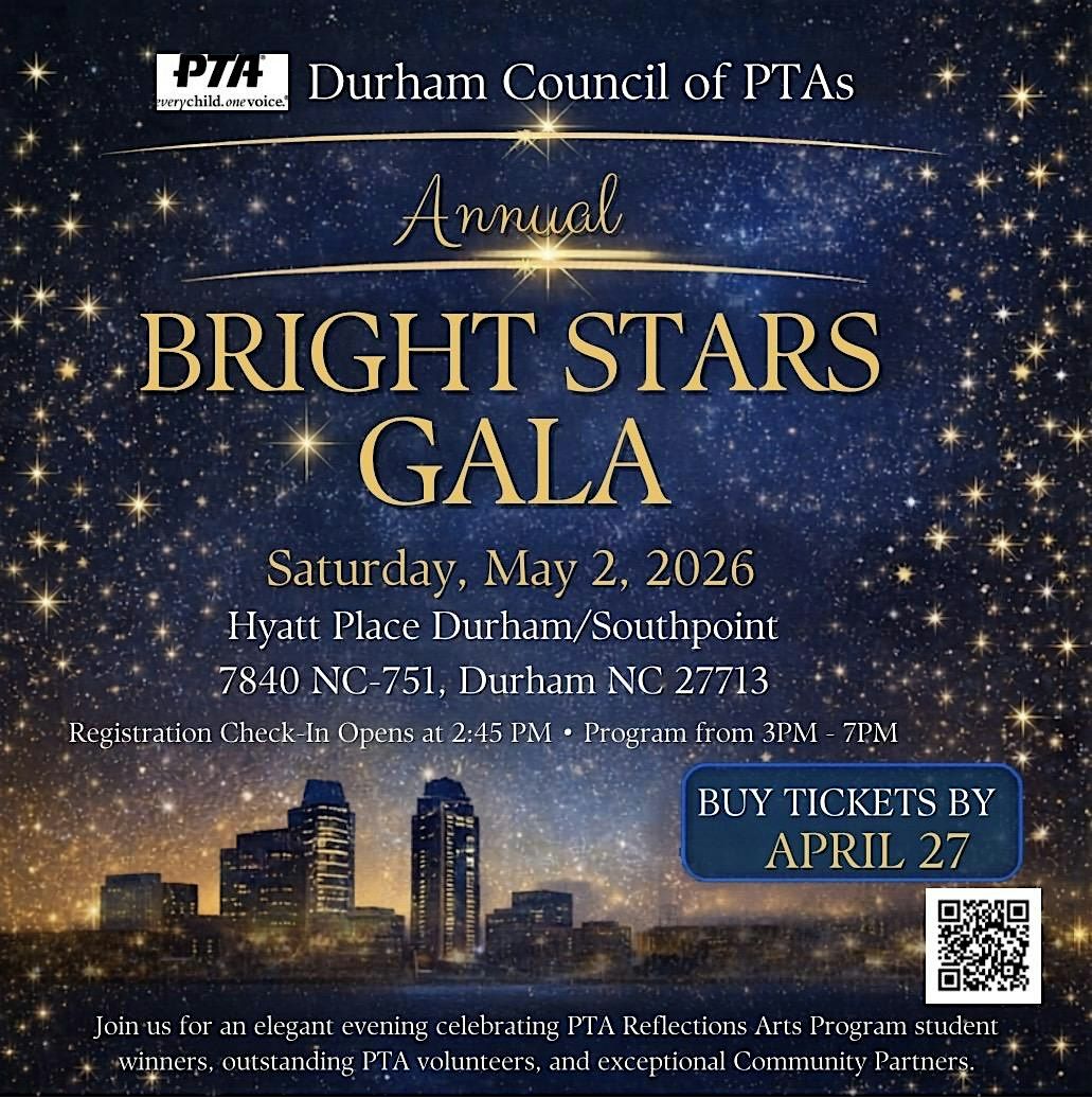 Join the Durham Council of PTAs for our elegant Annual Bright Stars Gala, a special evening dedicated to celebrating the students, volunteers, and community partners who make a difference in the lives of children across Durham.