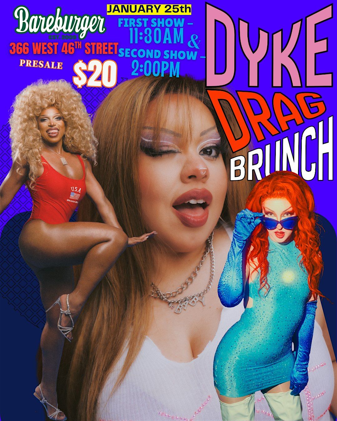 Join us for DYKE DRAG BRUNCH on Sunday, January 25 at 11:30 am (and 2pm if you're good) at Bareburger on West 46th St for sapphic shows, Bareburger's new brunch menu (meat, veggie, vegan and gluten free options, lesbians!), drink specials from Uncle Charlie's and more. Featuring special guest performances by Bertha Vanayshun and Jewel Marquee!