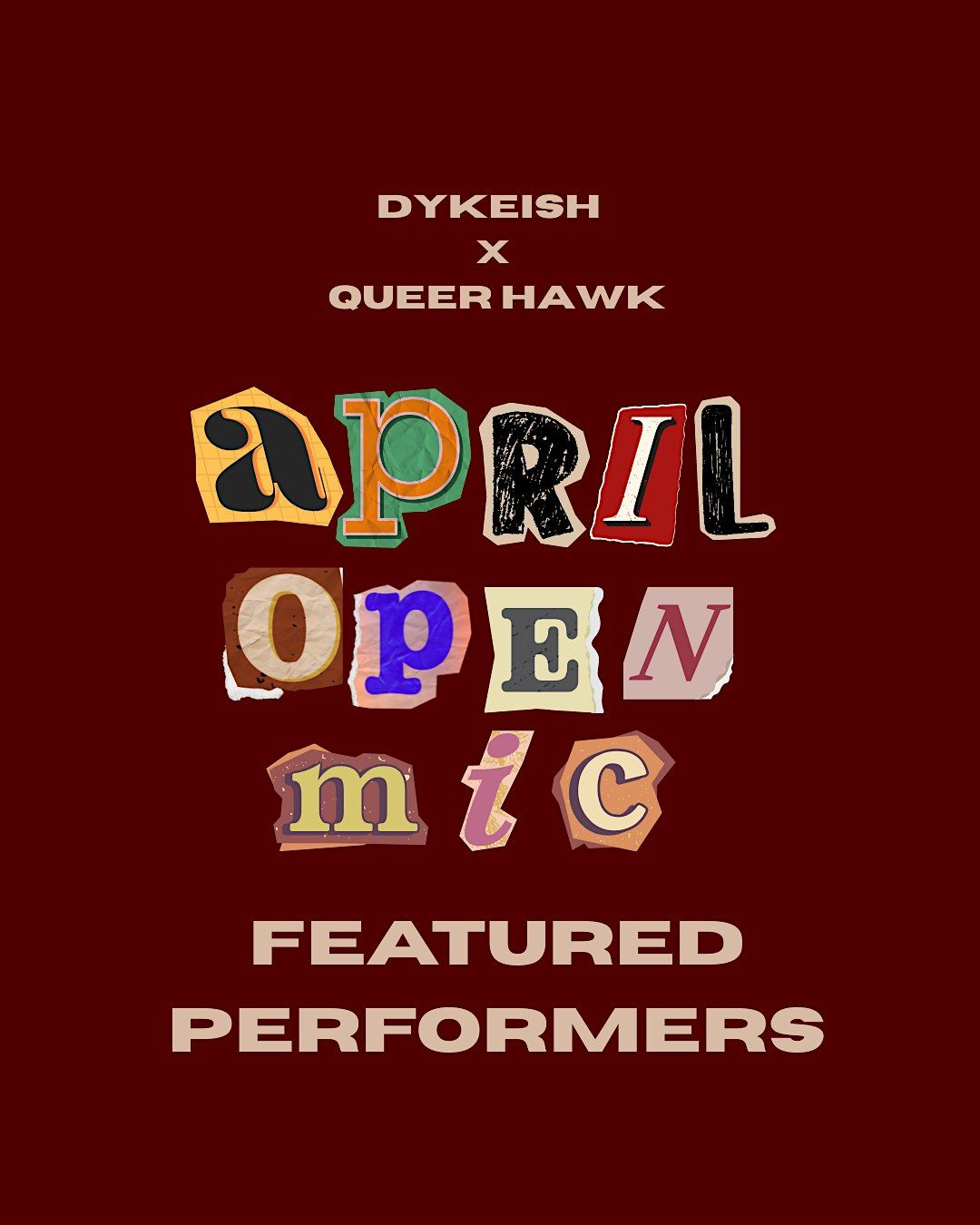 DYKEish once again brings you a night full of queer creativity and community hosted by Queer Hawk! We have four incredible featured artists and space to sign up on the night if you yourself would like to perform - whether you want to just enjoy watching or strut your stuff, you'll find a welcoming atmosphere and new friends at our monthly open mics!