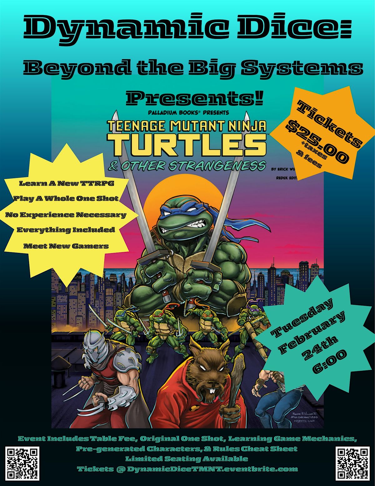 Get ready to dive into the wild world of Teenage Mutant Ninja Turtles and Other Strangeness Redux β learn to play this awesome game while playing this awesome game! No experience necessary. The only thing you need to bring is an open mind! Wheather you're a fan of the classic heroes in a half shell or just love fun, quirky tabletop adventures, this event is your jam. Meet fellow fans, roll those dice, and experience the chaos live. Don't miss out on the fun, come hang with us and unleash your inner mutant while playing a full one shot with fun original pre-generated characters!