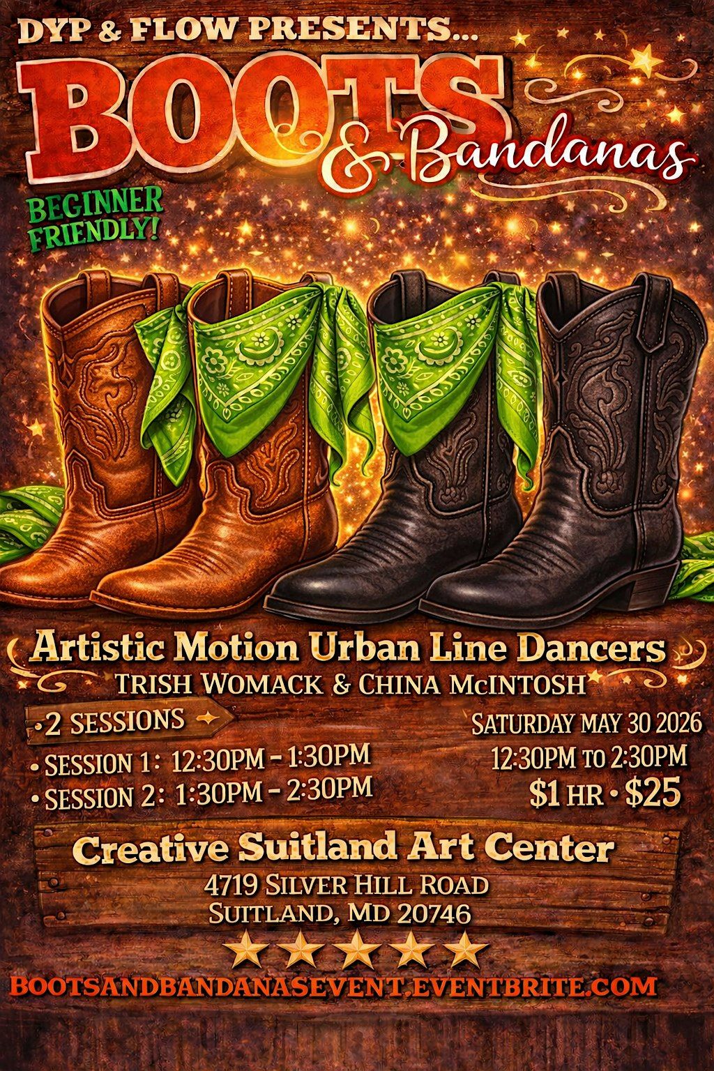 *Participants assume responsibility for their physical activity during the line dance instruction. DYP & Flow, Artistic Urban Line Dancers, and Creative Suitland Art Center are not liable for injuries sustained during participation.
