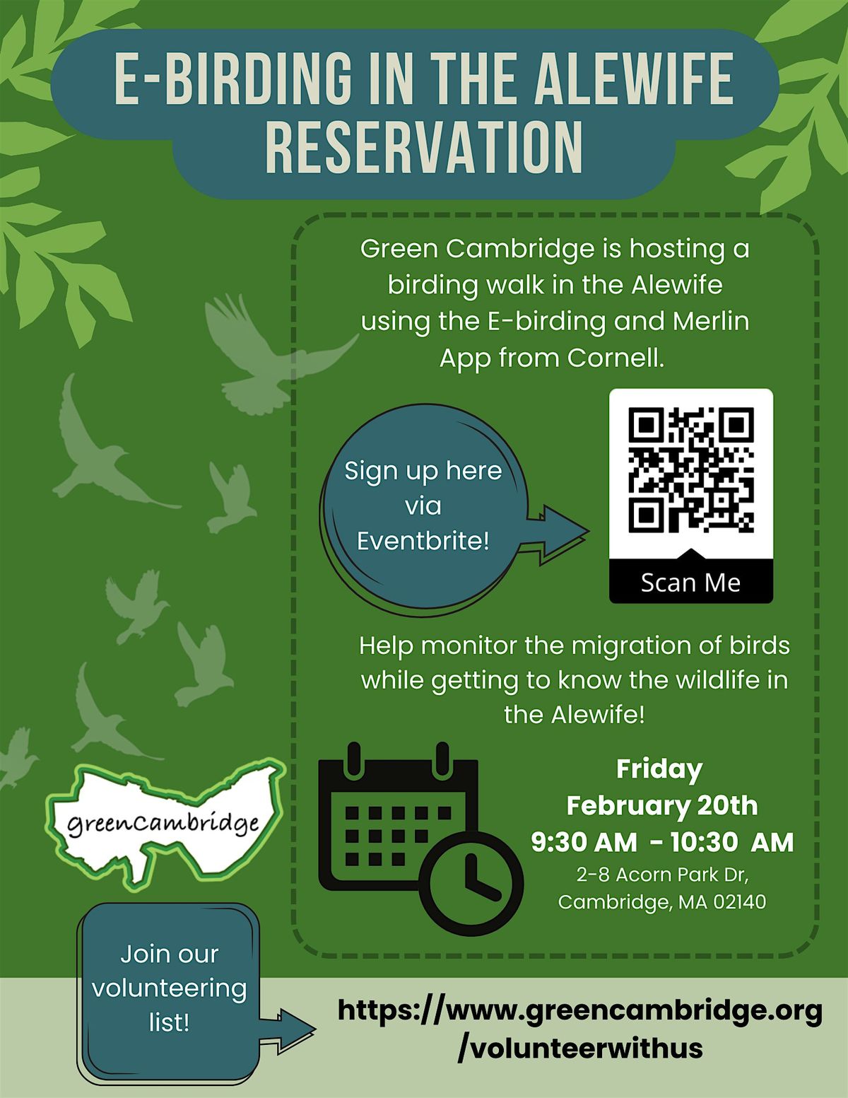 Green Cambridge is hosting our first ever E-birding event in the Alewife!