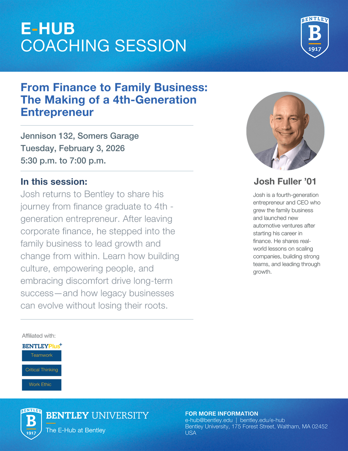 Josh returns to Bentley to share his journey from finance graduate to 4th - generation entrepreneur. After leaving corporate finance, he stepped into the family business to lead growth and change from within. Learn how building culture, empowering people, and embracing discomfort drive long-term success—and how legacy businesses can evolve without losing their roots.
