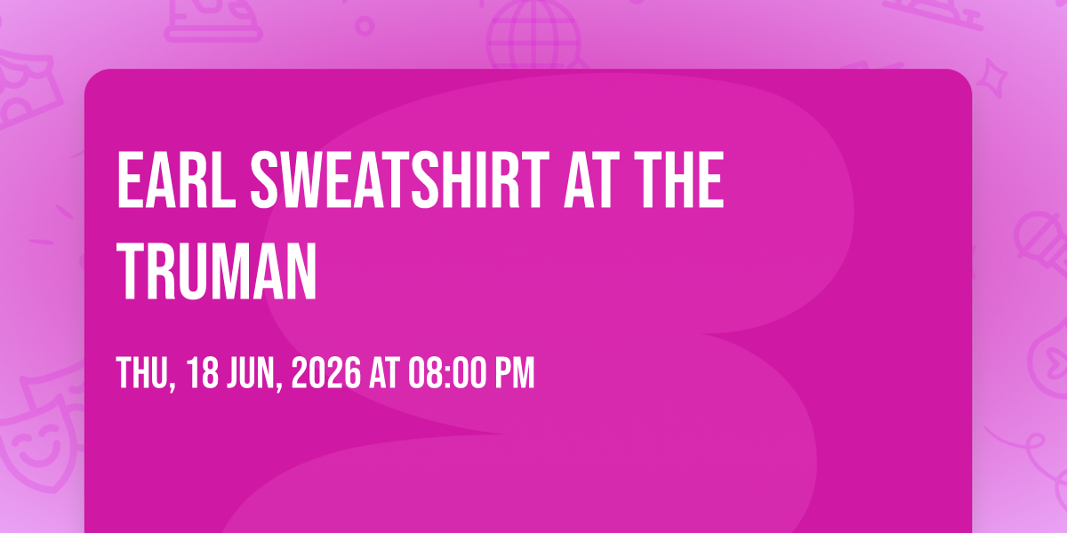 π Welcome to Earl Sweatshirt at The Truman, where dreams come alive and possibilities are endless! ποΈ Join us at The Truman in the heart of Kansas City, MO for an event that defies expectations. π On June 18th, 2026 at 08:00 PM, be part of something truly extraordinary as we bring together innovation, entertainment, and pure magic. β¨ Every aspect has been carefully designed to ensure an unforgettable experience for all our guests. Whether you're seeking adventure, inspiration, or simply a break from the ordinary, this event promises to deliver beyond your wildest dreams. π Prepare for a journey into the extraordinary!