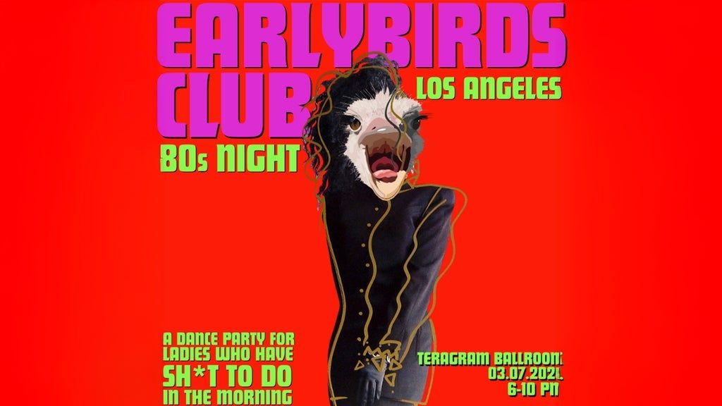 Teragram Ballroom presents: Earlybirds Club [March 7, 2026 / / Doors 6pm (10pm curfew) / $31 / 21+] Earlybirds Club is a dance party designed for women, trans, and non-binary folks that starts at 6pm and ends at 10pm?because we have sh*t to do in the morning! At 80s Night, we?ll be throwing down the best tracks of the decade, from Prince to Madonna, and from Depeche Mode to Ms. Jackson (if you?re nasty). Earlybirds Club is more than a fun night out, it's a supportive space where kindness, good vibes, and sensible footwear rule. Come as you are ? there's plenty of room on the dance floor for everyone. 10% of ticket proceeds benefit Harvest Home, which transforms the lives of homeless pregnant women and their children by providing housing, support, and programs that equip women to become great mothers. Note: By purchasing these tickets, you are consenting to be photographed for promotional purposes. People of all backgrounds and identities are encouraged to attend all of our events