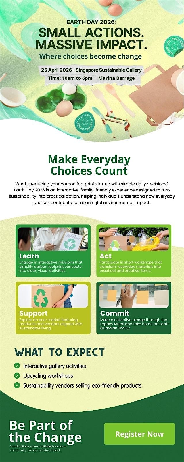 Celebrate Earth Day with a meaningful and engaging experience at the Sustainable Singapore Gallery, where everyday choices take centre stage in shaping a more sustainable future. Earth Day 2026: Small Actions, Massive Impacts invites families, youths, and members of the public to explore how simple actions in our daily lives can collectively make a powerful difference for the planet.