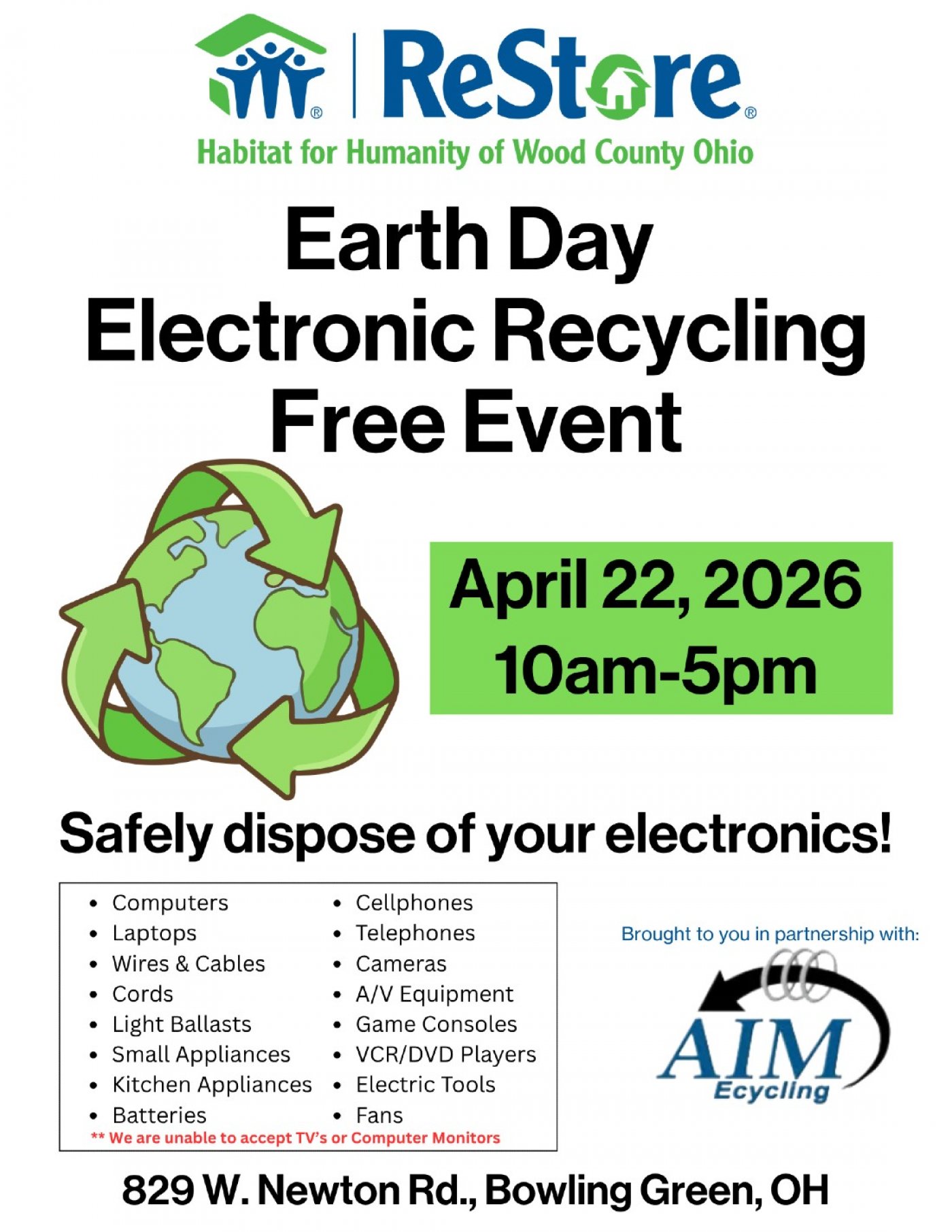 Join us on April 22nd, 2026 at the ReStore of Wood County and safely dispose of all un-needed or broken electronic devices.