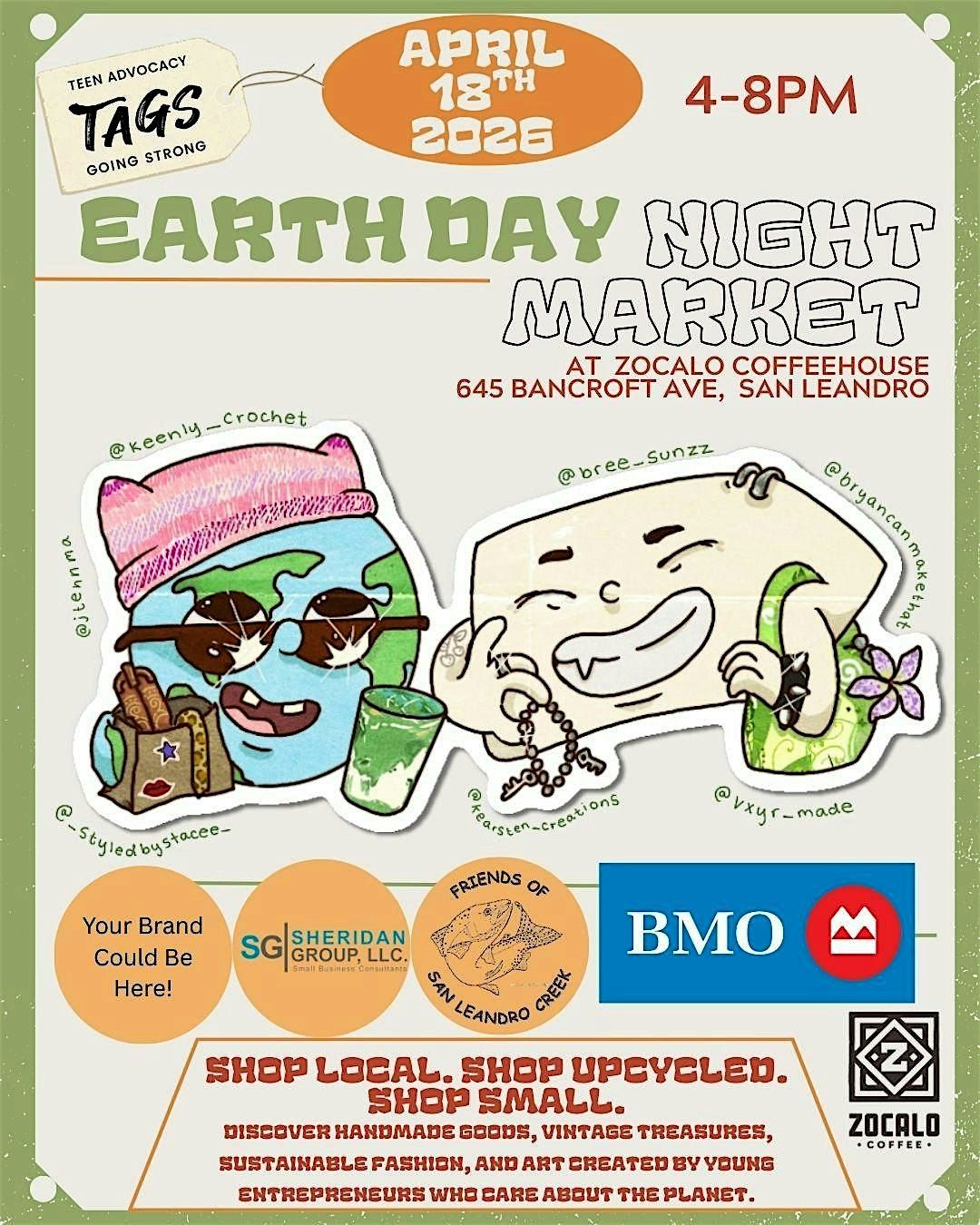 The Earth Day Night Market will be held at Zocalo Coffeehouse, a beloved local café known for its delicious coffee, drinks, and tasty noshes—perfect for enjoying while you explore the market.