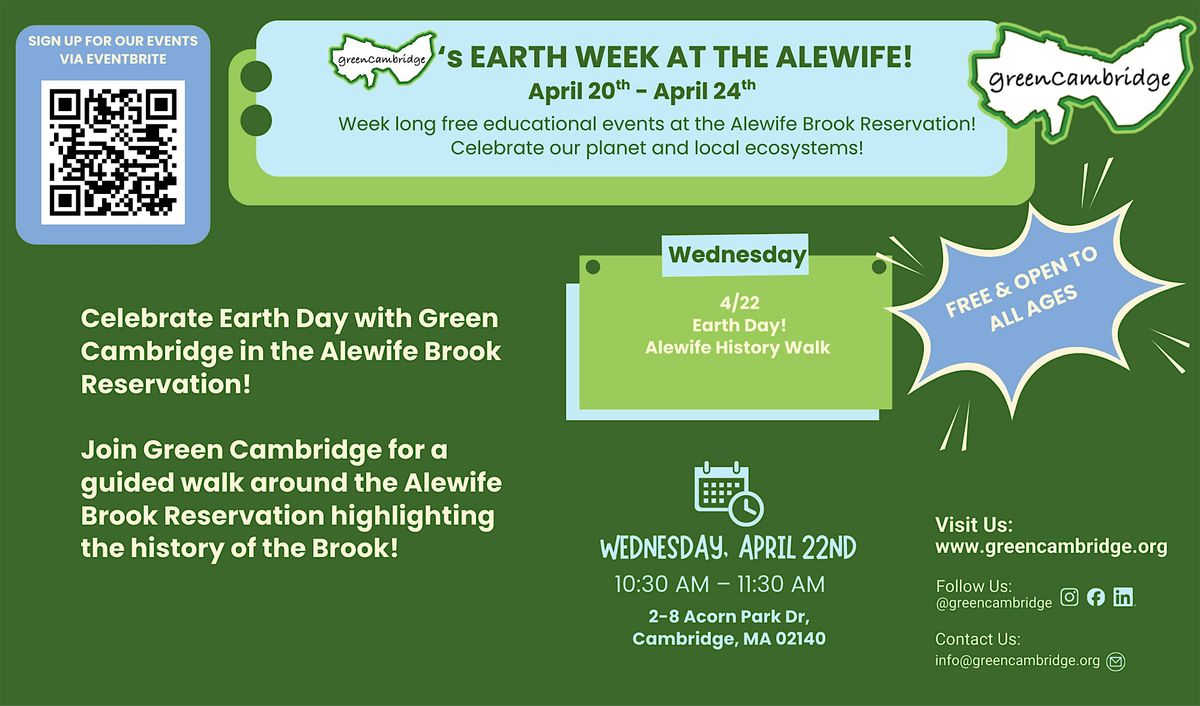 Join Green Cambridge for a guided educational walk this Earth Day highlighting the history of the Alewife Brook Reservation!