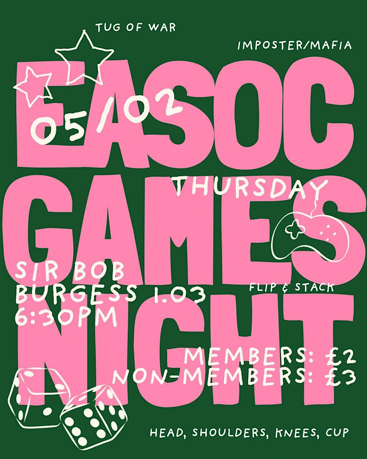 EASOC GAMES NIGHT at the Sir Bob Burgess Building 1.03! Get ready for a fun-filled evening on February 5, 2026 at 6:30 PM. Bring your A-game people!!!