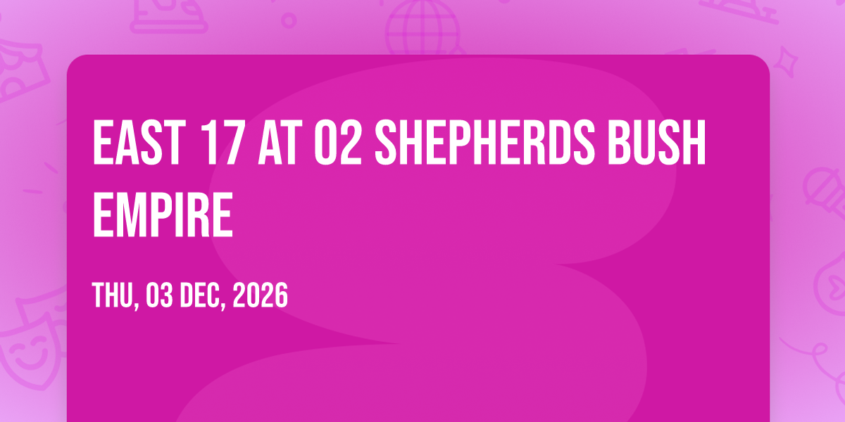 π Prepare to be amazed at East 17 at O2 Shepherds Bush Empire, the most anticipated gathering of the season! π Set against the stunning backdrop of O2 Shepherds Bush Empire in vibrant London, EN, this event promises to redefine your expectations. π Mark your calendars for December 3rd, 2026 at 07:00 PM and get ready to immerse yourself in an atmosphere of wonder and excitement. β¨ From the moment you arrive, you'll be transported into a world where memories are made and stories come alive. They have crafted an experience that perfectly harmonizes entertainment, innovation, and community spirit. π Join us as we create moments that will be discussed for years!