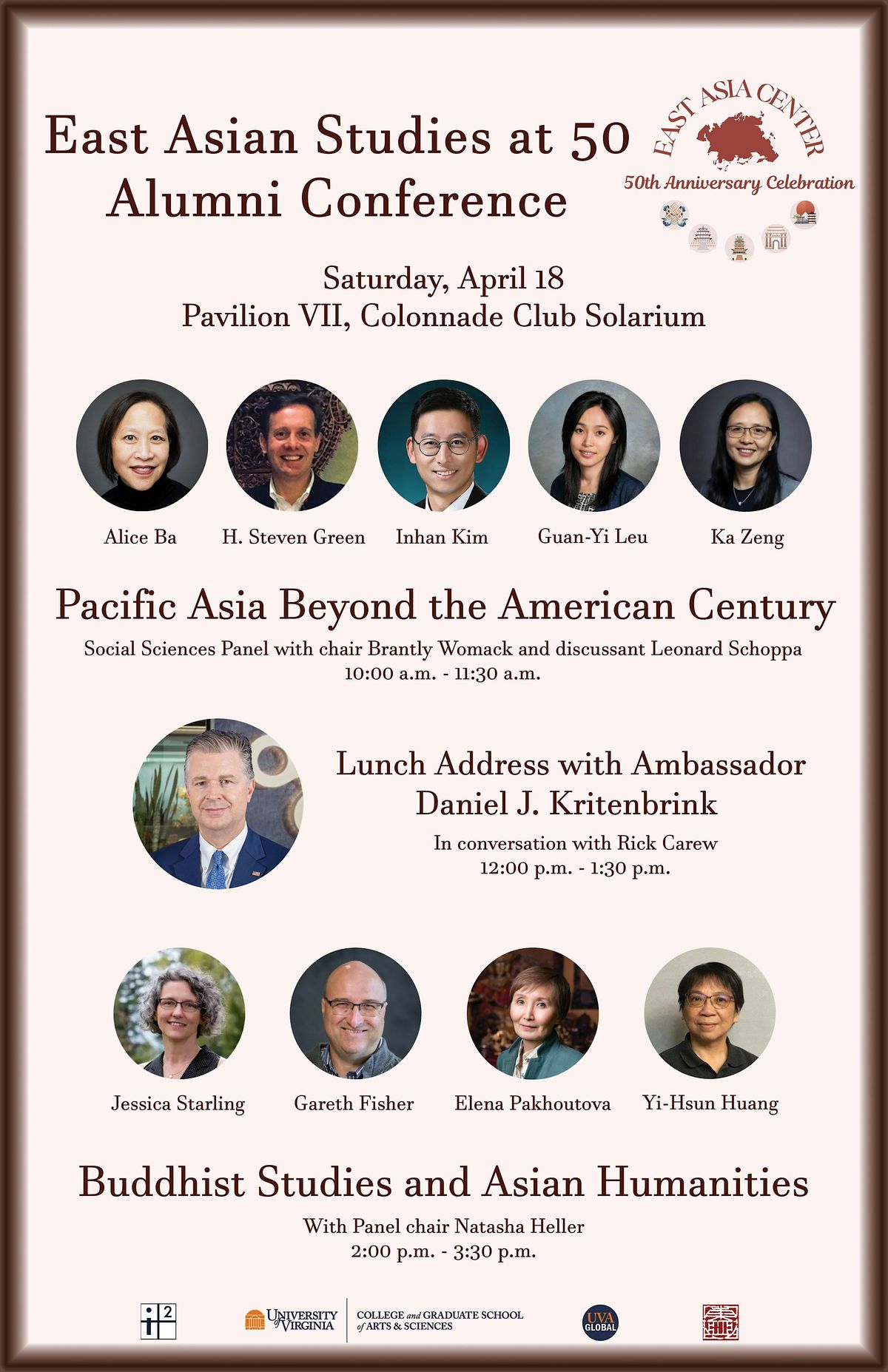 Featuring UVA graduates who are experts in their fields, including a special presentation with former United States Assistant Secretary of State for East Asian and Pacific Affairs Daniel Kritenbrink, we will have panels exploring “Pacific Asia Beyond the American Century ” as well as “Buddhist Studies and Asian Humanities.”