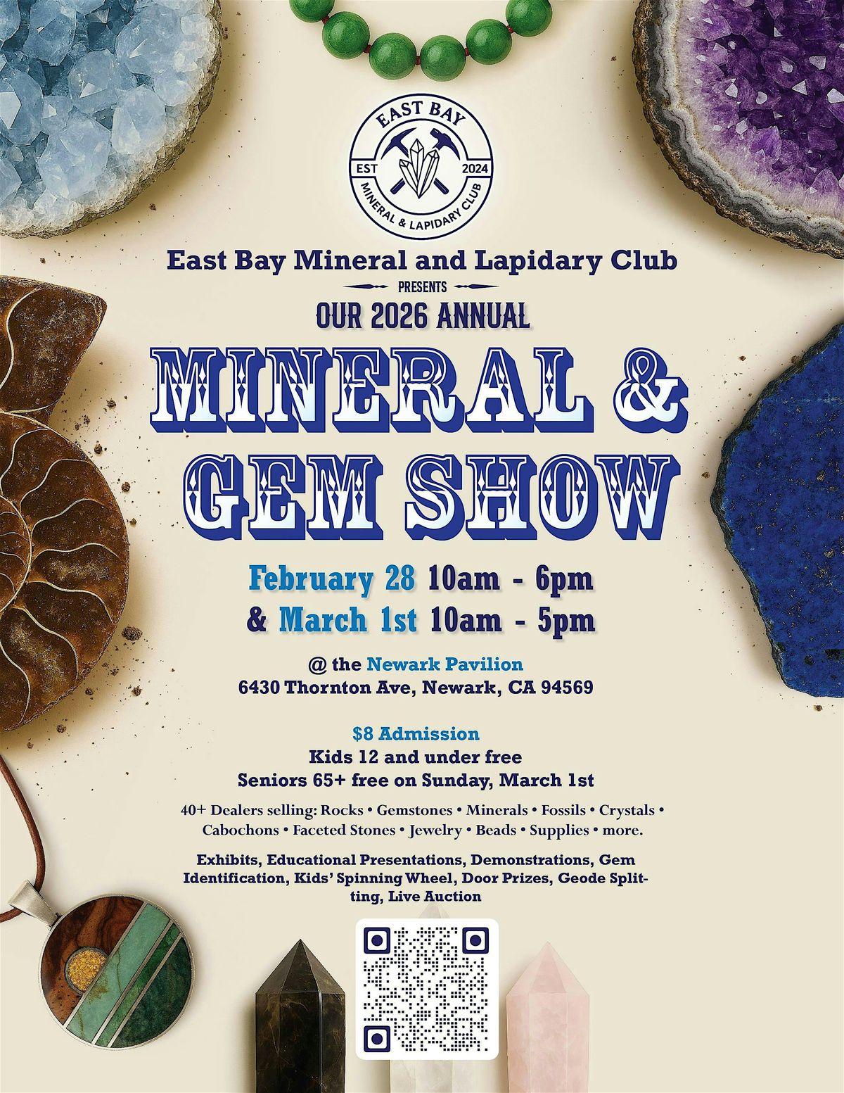 Join the East Bay Mineral and Lapidary Club (EBMLC) at our 2026 Annual Mineral and Gem Show taking place on February 28th and March 1st at the Newark Pavilion located at 6430 Thornton Ave, Newark, CA. EBMLC is excited to bring you another weekend of gems, minerals, and more. You'll experience demonstrations, exhibits, gem identification, kids’ spinning wheel, door prizes, geode splitting, and a live auction. Come and the many things you can do with rocks & minerals with 40+ Dealers selling: Rocks, Gemstones, Minerals, Fossils, Crystals, Cabochons, Faceted Stones, Jewelry, Beads, Supplies + more. Join us for this 2-day gemology and geology extravaganza!