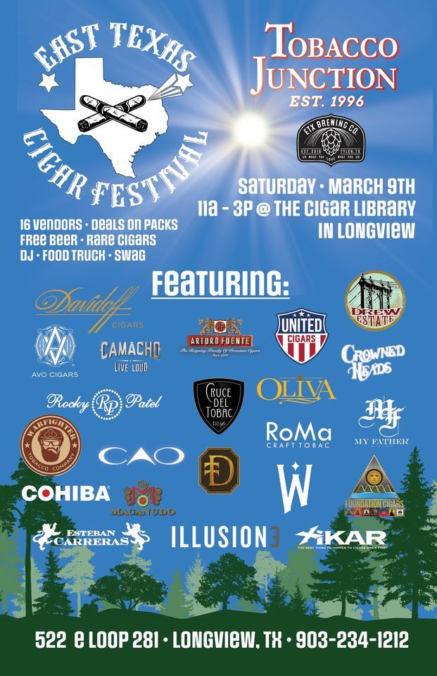 The festival will run from 11 am - 3 pm on Saturday the 9th. Attendees will have the opportunity to meet and greet representatives form the largest cigar houses in the world, purchase discounted packs from all vendors, enjoy free beer form East Texas Brewing, listen to a house DJ, visit our food truck and enjoy our newly remodeled 1,550 sq ft humidor and expanded lounge. There will be swag give aways for cigar related goods and a ton of raffle prizes for high end humidors and other items.