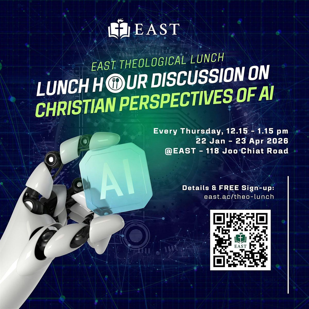 EAST is organising a series of Theological Lunch discussions for Christians this semester looking at the various biblical, educational, ethical, and theological issues as it relates to AI or artificial intelligence. Topics to be covered include: