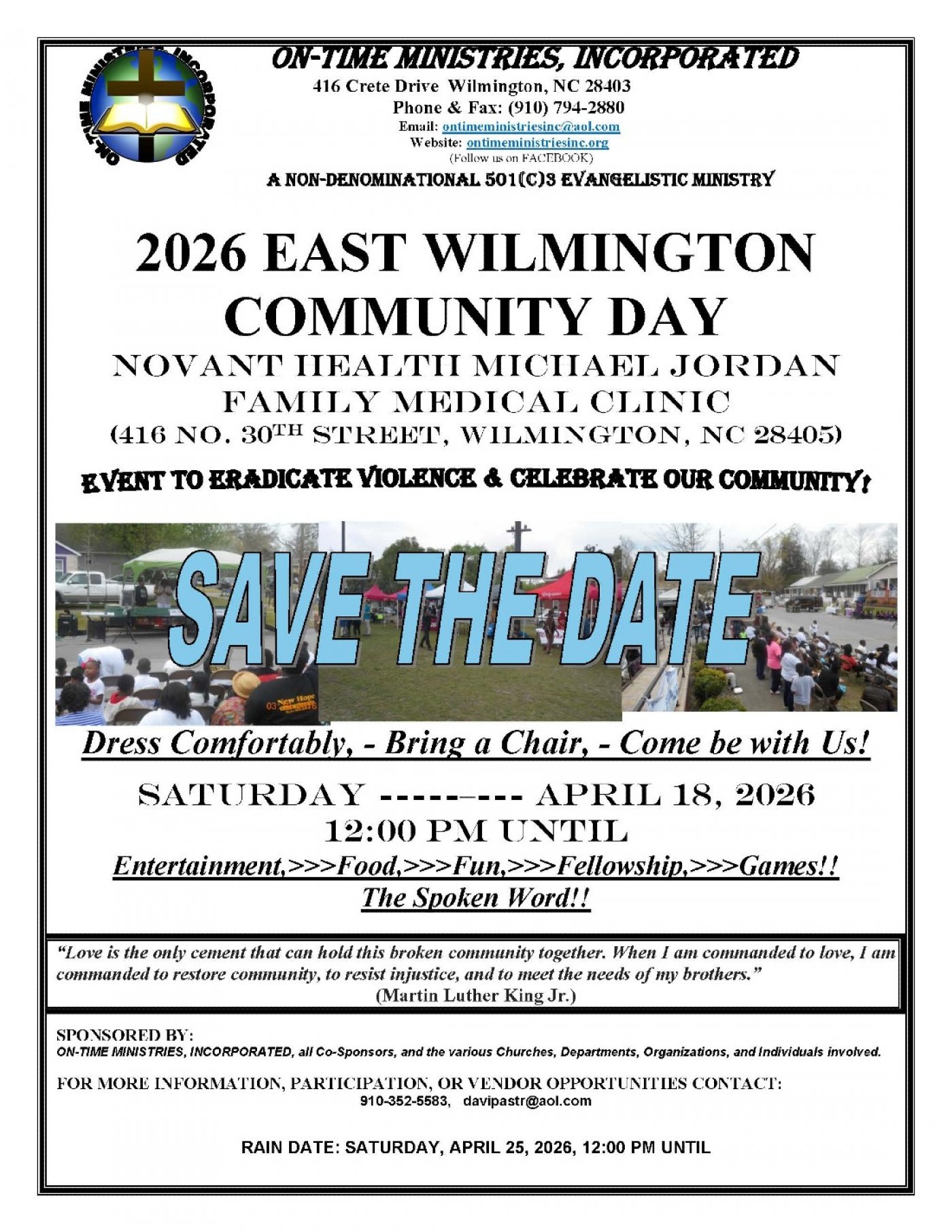 Eighth annual outdoor event for the young and old consisirting of fun, fellowship, food, entertainment, and the spoken word. Bring a chair and enjoy yourself.