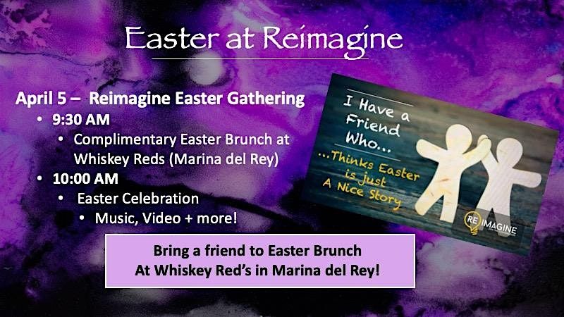 Get ready for a super fun day in person celebrating Easter with friends and family! Enjoy a beaufiul view of the bay along with your complimentary amazing brunch at Whiskey Reds. Plus great music, and Reimagine's signature "mini-film" message - unpacking the question, "Easter: Good Story, or True Story?" Space is lmited, so register for your free tickets today!