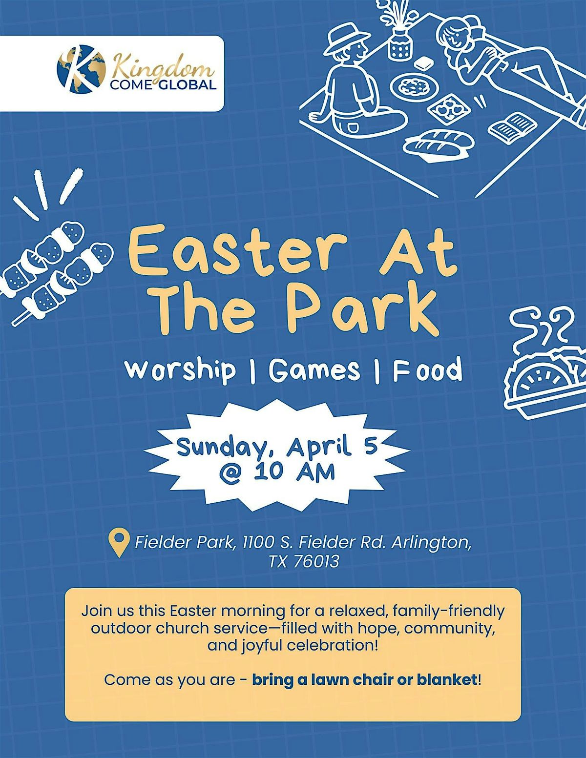 Join us for a relaxed, outdoor Easter service (hosted by Kingdom Come Global Church) filled with hope, encouragement, and community. This is a space where you can come as you are and take a deep breath in relaxed outdoor enviroment! Perfect for individuals, couples, and families of all ages!