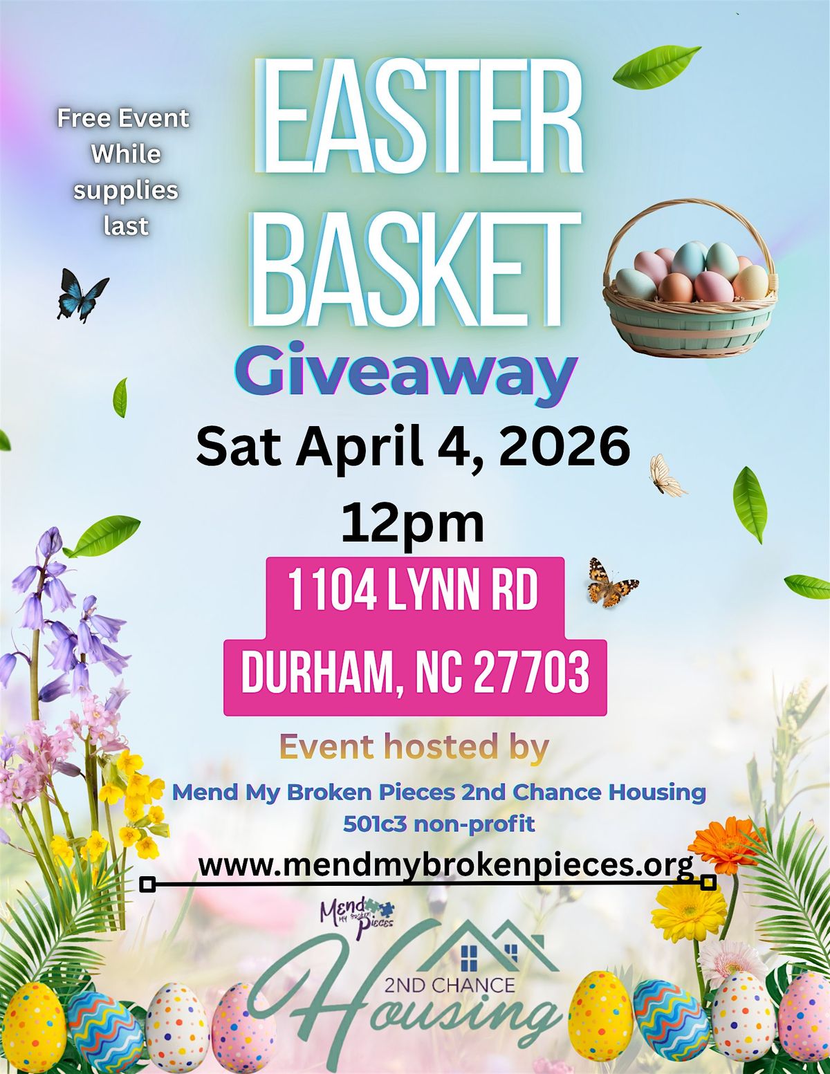Free Event| Easter Basket Giveaway hosted by Mend My Broken Pieces 2nd Chance Housing non-profit 501c3. Event Rain or Shine.