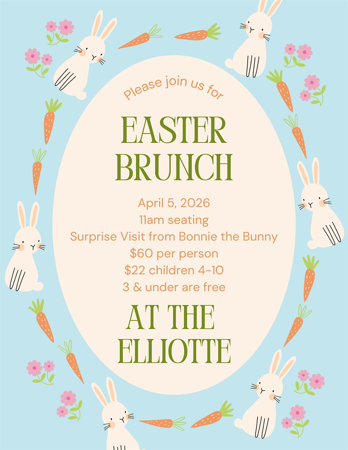 Join us for a beautiful spring celebration at The Elliotte this Easter. Weβve curated a brunch experience that blends elevated comfort dishes with a soft, garden-inspired atmosphere β the perfect way to gather with family and friends. Doors open at 11am and brunch will be ready for 11:30 for guests to enjoy. Bonnie the Bunny will also be making an appearance for her second year for photo ops with the family!