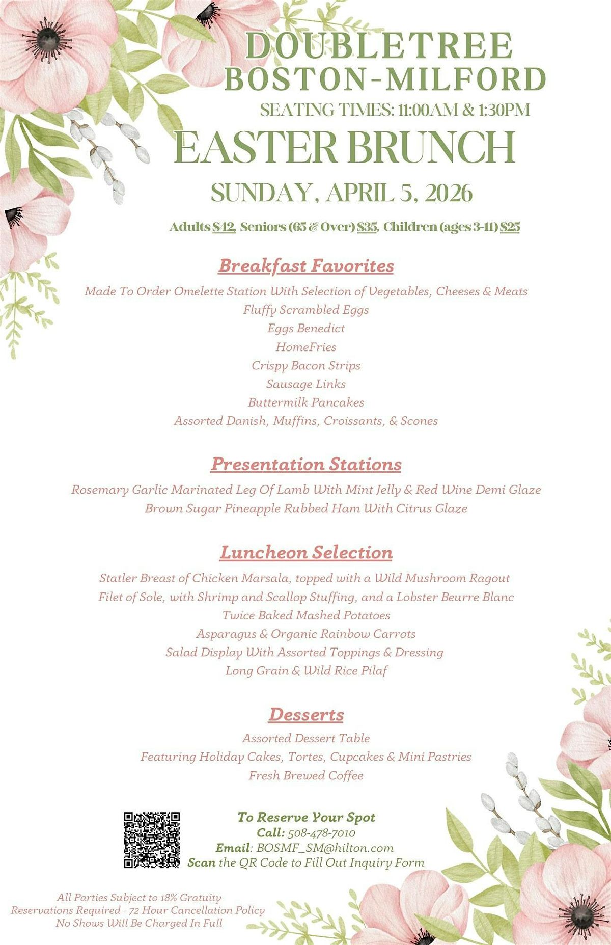 Join us on Sunday, April 5th, 2026 for a delicious Easter Brunch with seating at 11:00am or 1:30pm.Enjoy breakfast favorites like made-to-order omelets, Eggs Benedict, pancakes, bacon and more… plus carved leg of lamb, pineapple glazed ham, chicken marsala, seafood specialties, decadent desserts and fresh brewed coffee! Adults $42 | Seniors $35 | Children (3–11) $25 Call 508-478-7010 to reserve your tableReservations required – seating fills quickly!Gather your family and make Easter Sunday stress-free and delicious.Reserve your table here.https://docs.google.com/.../1FAIpQLSceSLbHW8jM4k.../viewform