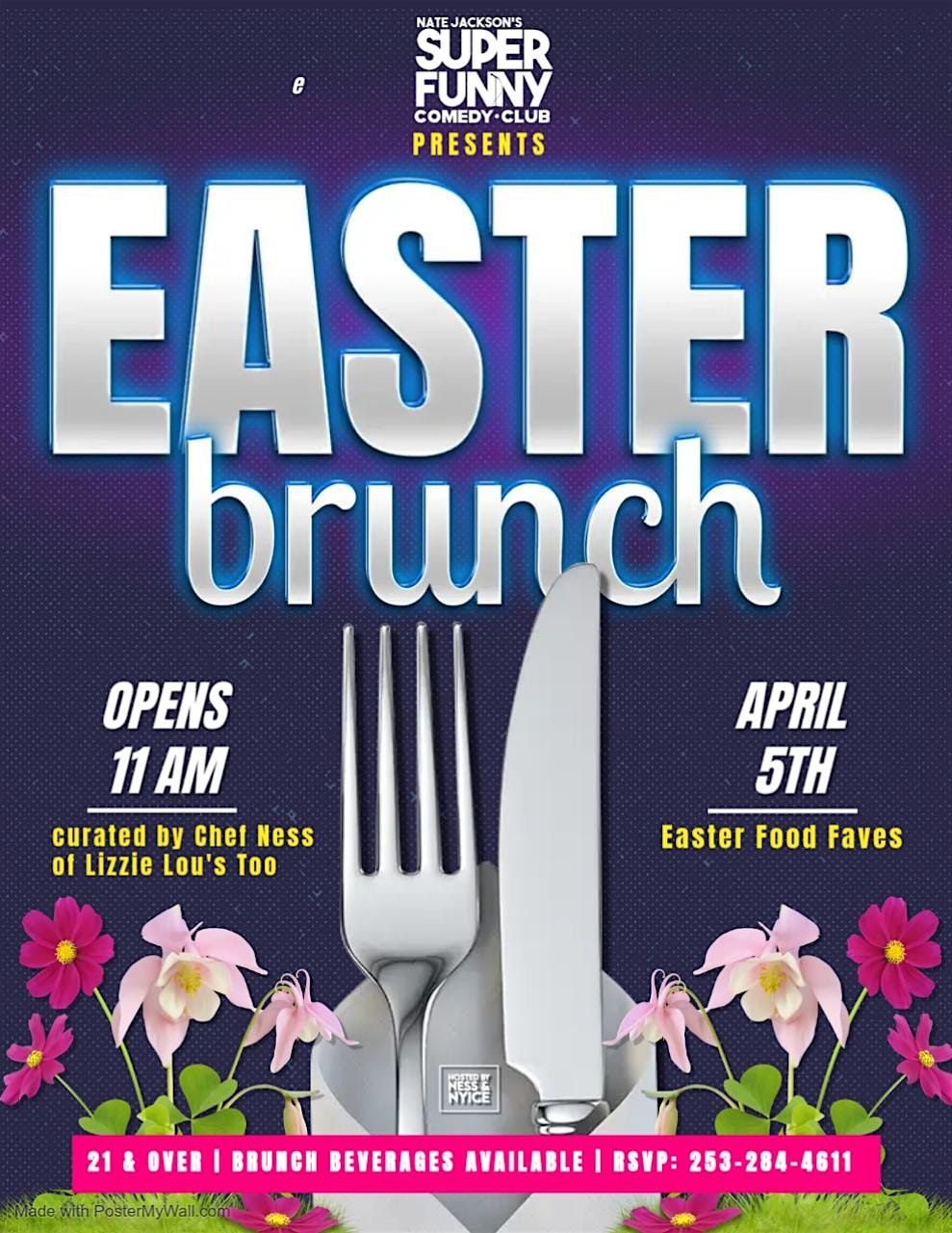 Join us for a delightful Easter Brunch at Nate Jackson's Super Funny Comedy Club. This event promises a unique blend of fun and culinary delights curated by Chef Ness of Lizzie Lou's Too. Attendees will enjoy a variety of Easter food favorites in a vibrant and lively atmosphere. Perfect for those 21 and over, this brunch guarantees a memorable Easter celebration with good food and good laughs.
