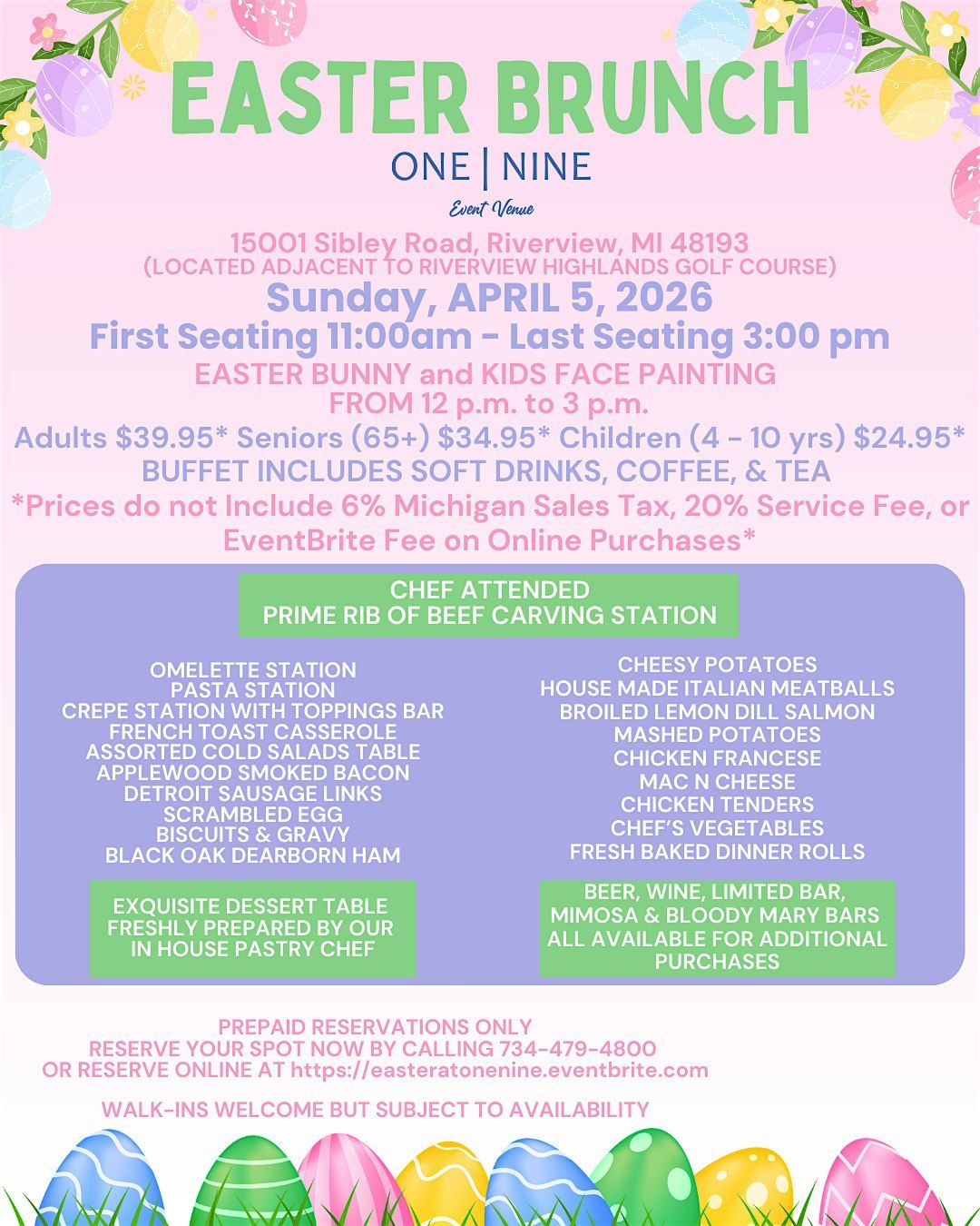 Welcome to Easter Brunch @ the One Nine Event Venue! Join us for a delicious feast on Sunday, April 5th , 2026 from 11:00am to 3:00pm. Indulge in a variety of tasty dishes and treats on our Easter Buffet, while enjoying the festive atmosphere. Featuring Prime Rib Carving Station, Dessert Table created by our in house Pastry Chef, Pasta and Omelette station, and so much more!! The Easter Bunny will be available for photos from 12pm to 3pm. We will also have face painting for our younger guests (ages 4-10) to add to the festivities!!! Bring your family and friends for a fun and memorable Easter celebration. Don't miss out on this opportunity to enjoy good food and good company. See you there!