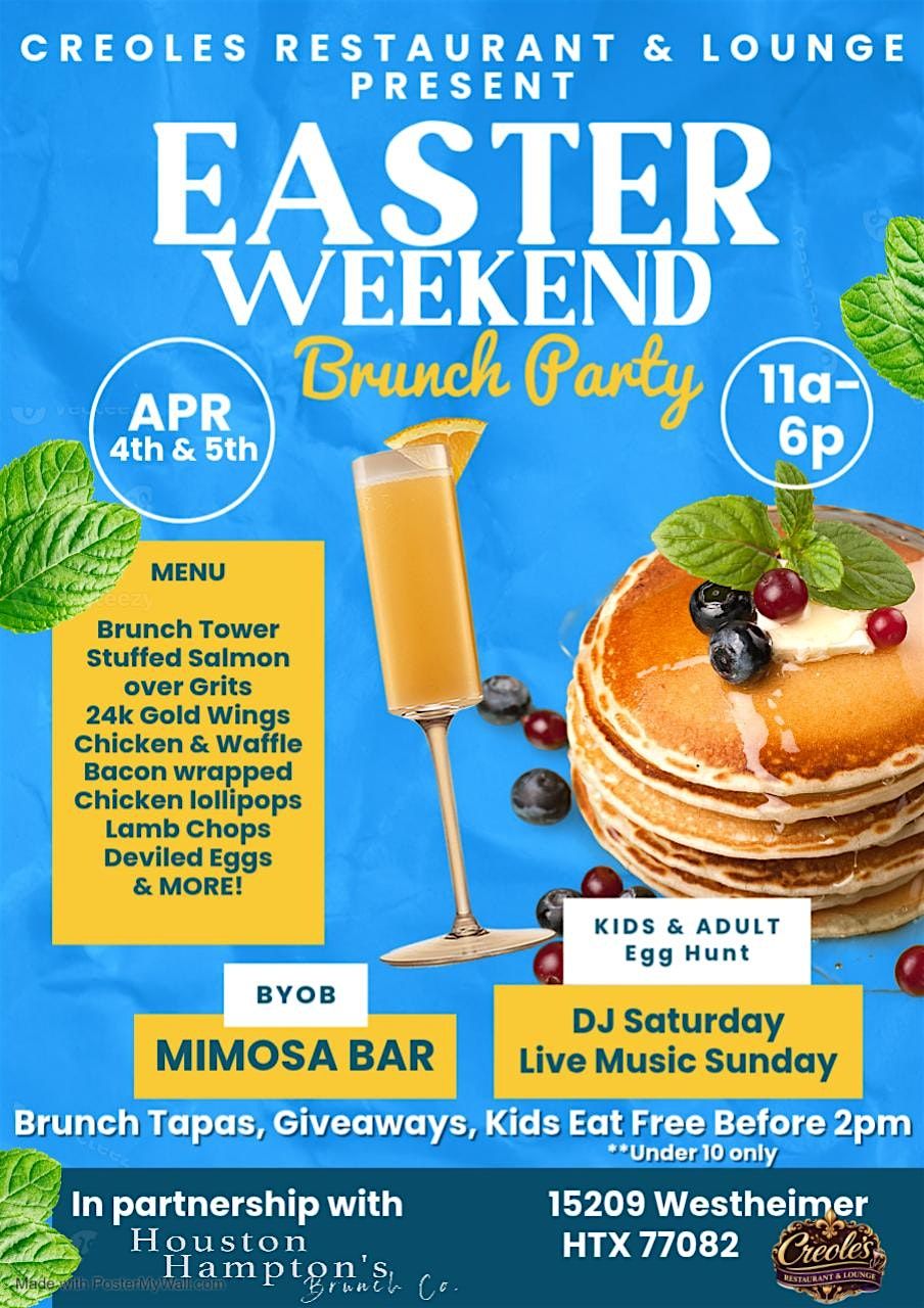 Join us for an amazing Easter Brunch Weekend at Creoles! Come enjoy tasty dishes, great vibes, and good company. Whether you're celebrating with family or friends, we've got the perfect atmosphere to make your Easter extra special. Don't miss out on some delightful eats and a fun weekend!