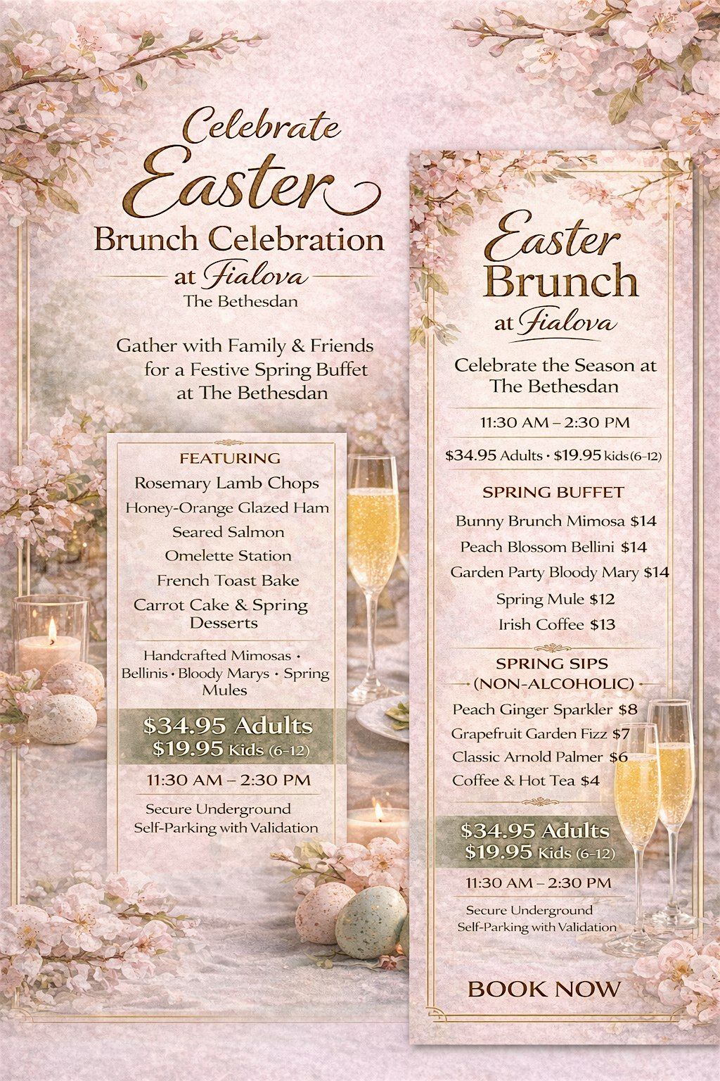 Celebrate Easter at Fialova at with a festive spring buffet featuring carved honey-orange glazed ham, rosemary lamb chops, seared salmon, made-to-order omelets, French toast bake, fresh salads, and classic carrot cake.