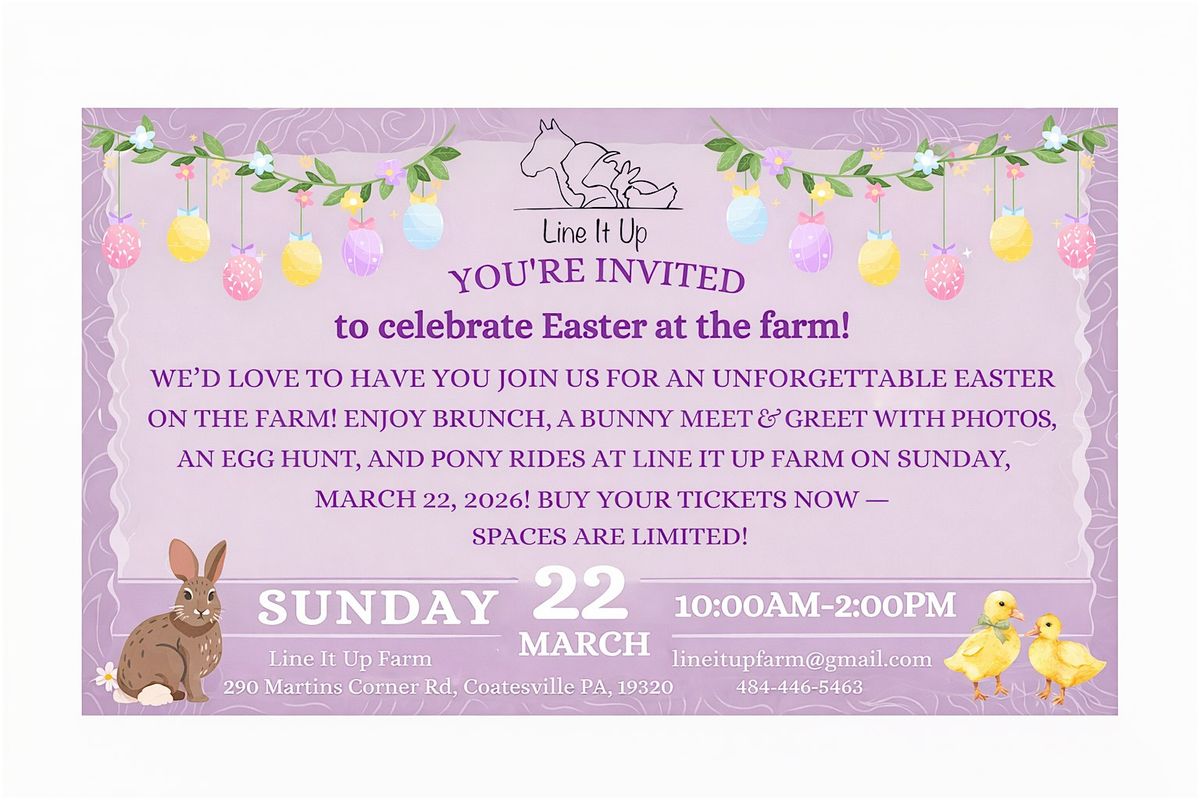 ๐ฐCelebrate spring with your family at Line It Up Farm on Sunday, March 22, 2026! Enjoy a delicious pancake brunch with a variety of toppings, fresh fruit, and savory bacon, then meet the Easter Bunny for photos, take part in age-specific egg hunts, ride friendly ponies, and create hands-on crafts to take home!
