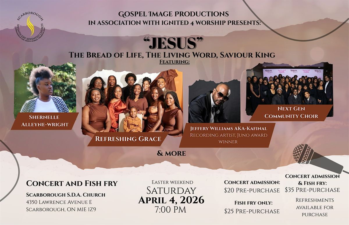 Gospel Image Productions (in association with Ignited 4 Worship) presents: “JESUS” Easter concert & fish fry, hosted at Scarborough Church.About this Event
