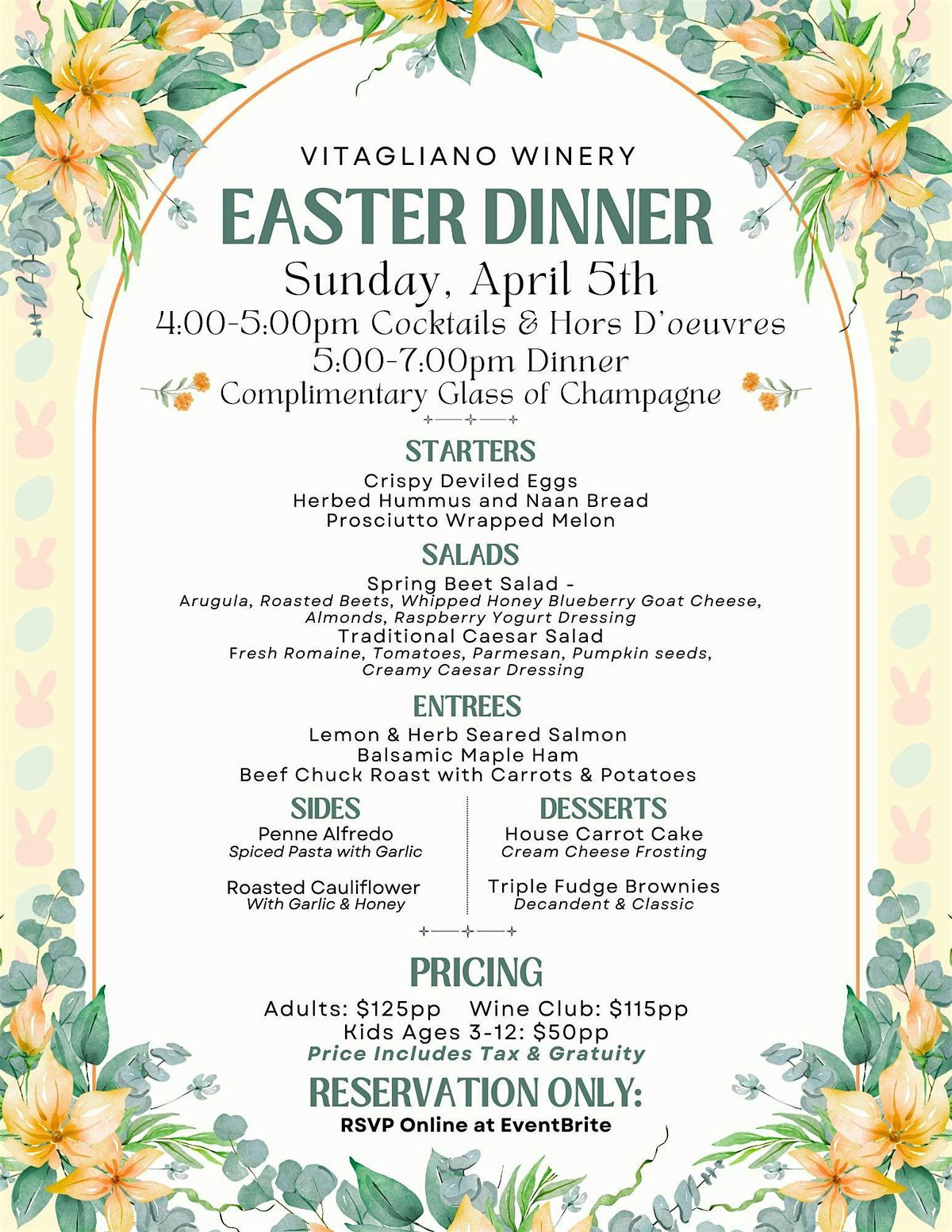 Celebrate Easter with an elevated evening of great food, wine, and warm company. Enjoy a curated full-course dinner buffet with complimentary champagne in a relaxed, welcoming setting—perfect for gathering with friends and family.