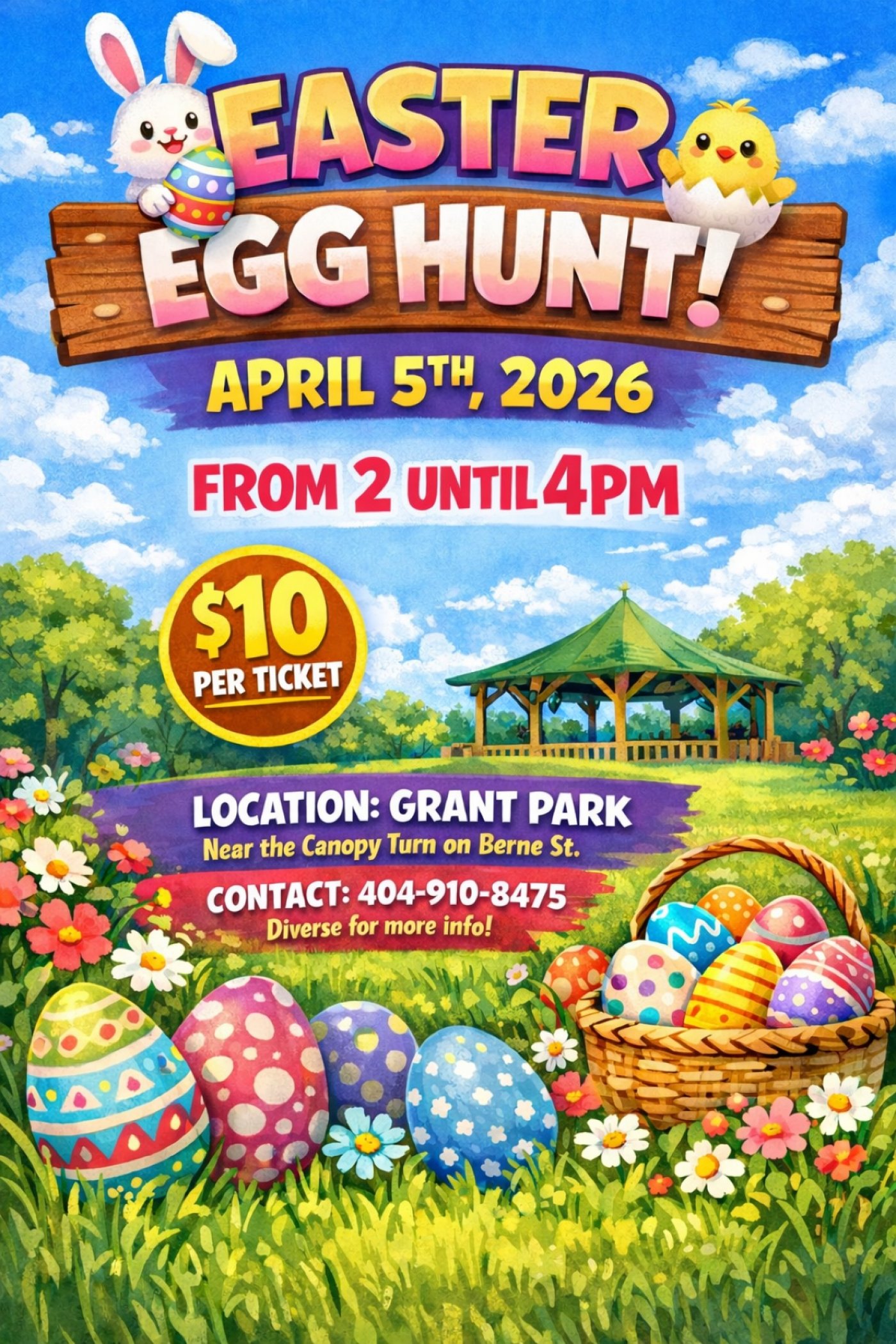 Step into a world of wonder and excitement at the Easter Egg Hunt hosted by Diverse Talented. Join us on April 5th, 2026, at Grant Park, Atlanta, GA, for a magical afternoon of hunting for hidden treasures.