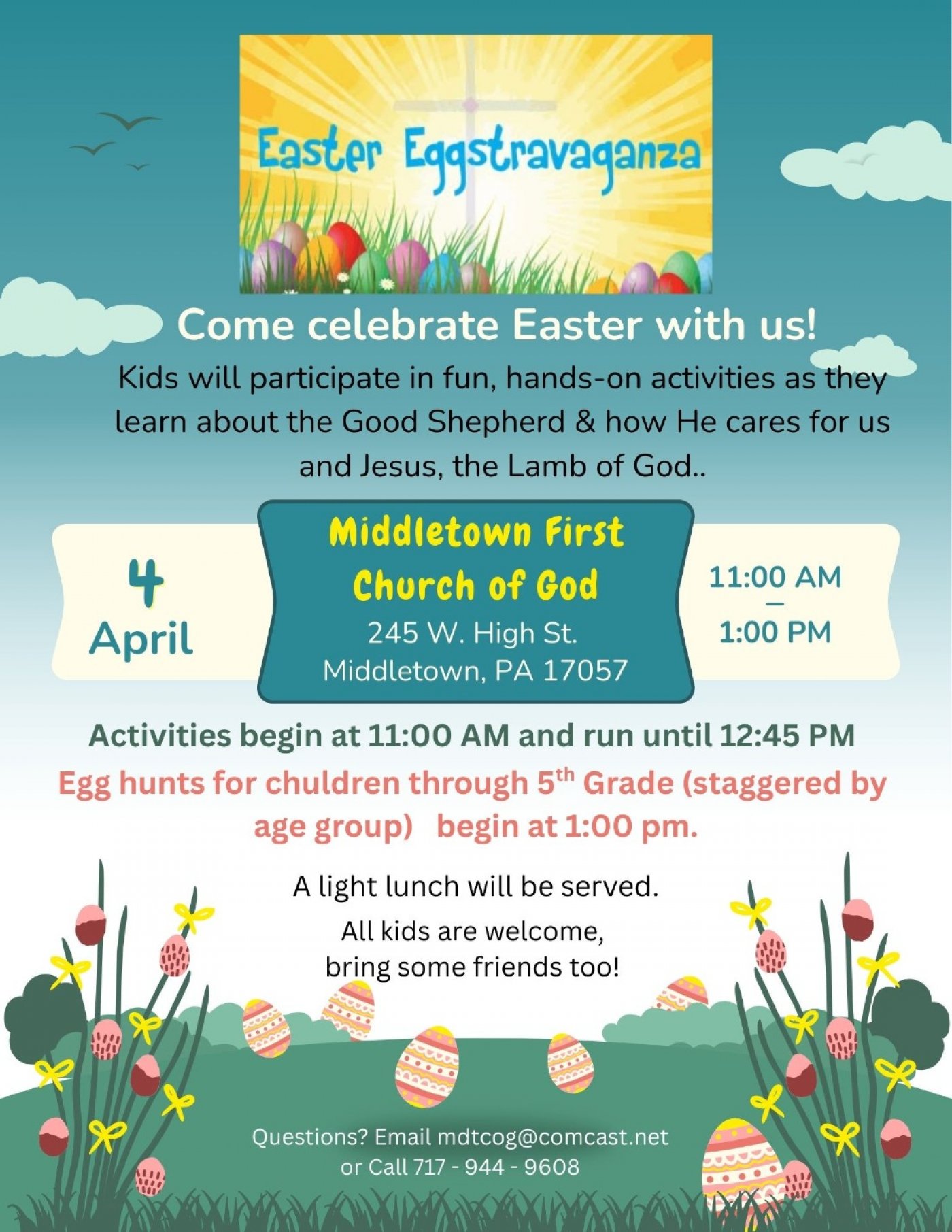 Saturday April 4-come celebrate Easter with us! Kids will participate in fun, hands-on activities as they learn about our Lord, the Good Shepherd, and how He cares for us and the sacrifice of the Lamb of God for all of us. Activities/stations begin at 11:00 am & run continuously until 12:45 pm. Egg hunts for children through 5th grade will be divided by age group with the youngest beginning at 1:00 pm. The next age group will begin approx. 5-10 minutes later and so on, to accommodate families with multiple children. . Please bring a basket or other container for the egg hunt. A light lunch will be served. All are welcome, bring some friends too!