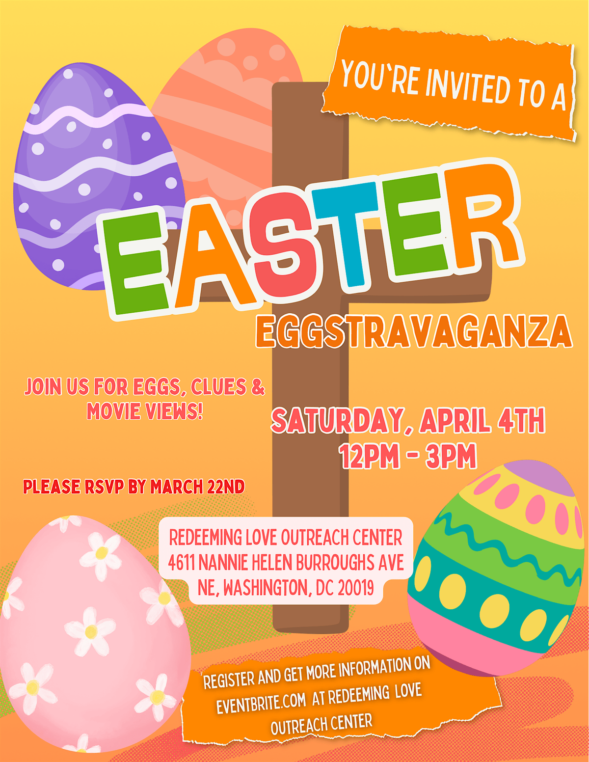 RLOC Youth Ministry is hosting a Eggstravaganza on Saturday April 4th from 12- 3pm at RLOC for ages 2-17. This event will feature a special movie just for the kids, arts and crafts, and a scavenger hunt! If you would like to attend this event we kindly ask that you register here on eventbrite or add your name to the sign up sheet on table in the Redeeming Love Outreach Center church lobby outside the sanctuary by Sunday March 22nd. Parents please include the name(s) and age of your youth to help with preparation. Non-members are welcomed to attend and all youth must be accompanied by an adult. If you would like to volunteer please email [email protected].