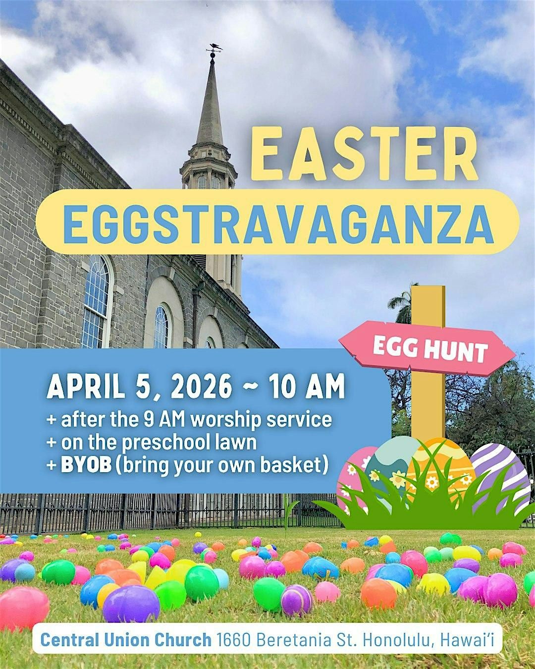 It's BYOB—keiki are invited to bring a basket and collect as many eggs as they want. The eggs will be empty (like the tomb on Easter morning) but they can turn in their eggs in exchange for a goody bag!