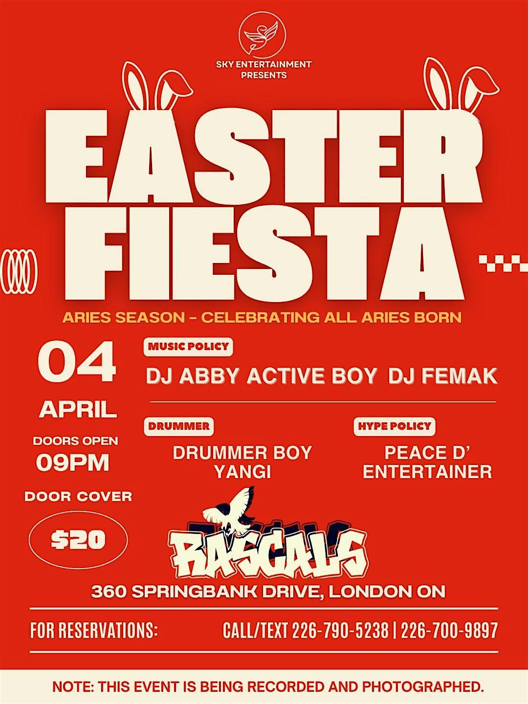 Get ready for a fun-filled day at our Easter Fiesta! Join us on APRIL 4, 2026 at 09:00 PM (Eastern Time) for fun, dance , drinks, treats, and good vibes. Bring your friends and family to celebrate and enjoy some awesome night with the hottest DJ's (Abbby, Femak and Active), Hype MC (Peace), and the celebrity Drummer Boi Yangi. Don't miss out on the excitement – it's gonna be a blast!
