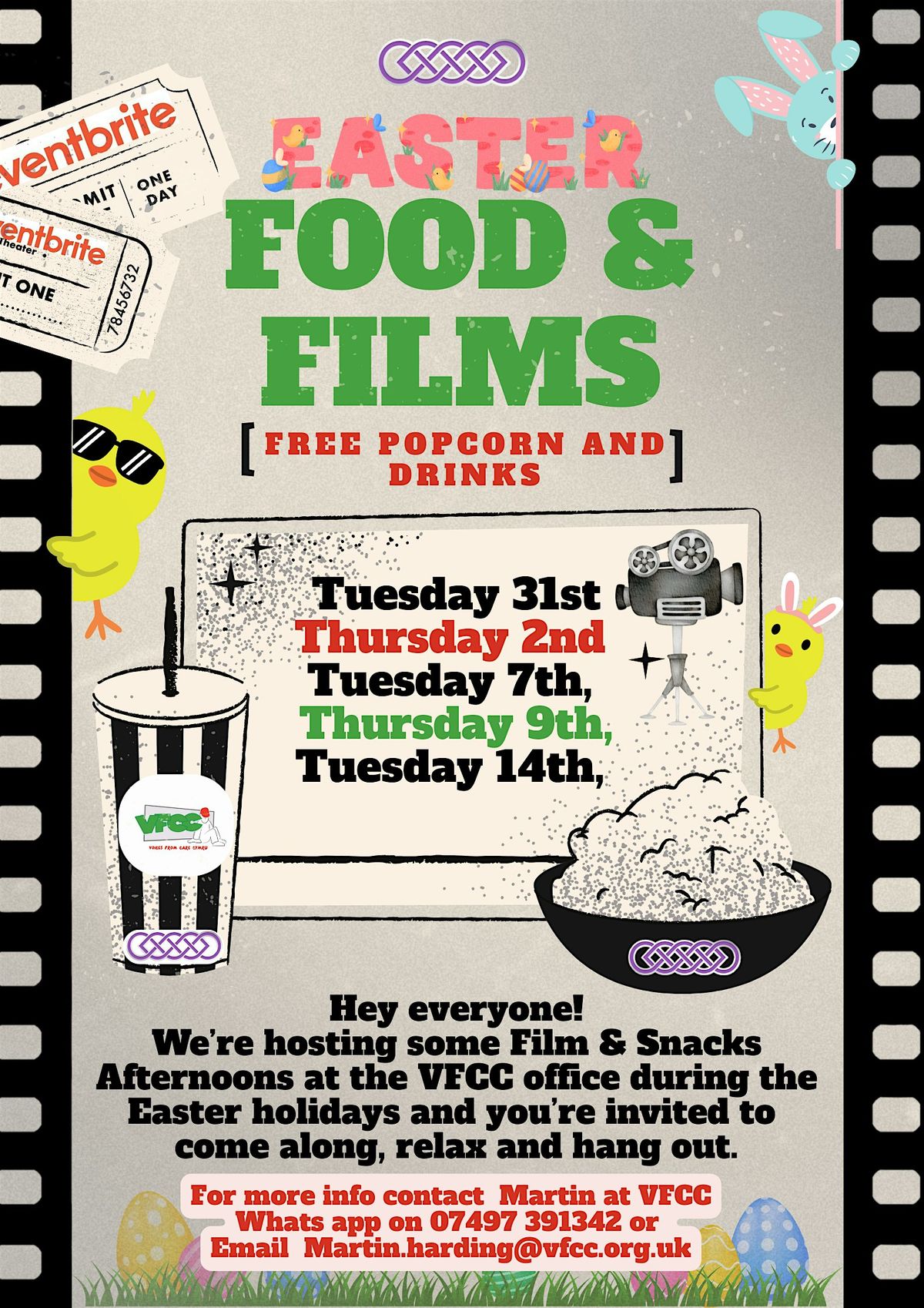 Hey everyone! Join us for Film & Snacks afternoons at the VFCC office this Easter—relax, watch, and hang out!
