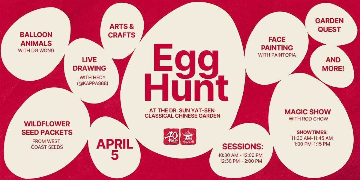 Join us in person for a fun-filled Easter adventure at the beautiful Dr. Sun Yat-Sen Classical Chinese Garden. Explore the stunning gardens while hunting for hidden treasures and enjoying different activities. Perfect for families and friends looking to enjoy a fantastic spring day outdoors. Don't miss out on this unique celebration combining tradition, nature, and a little bit of mystery. See you there!