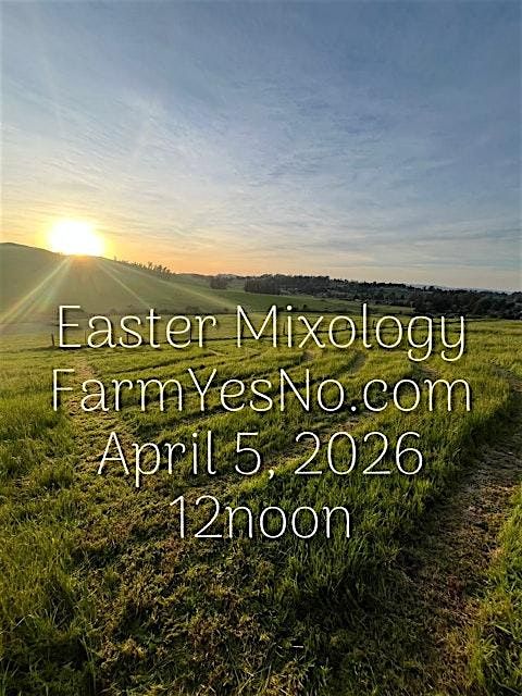 Sunday April 05th, 2026. Celebrate with an activity-based mixology class at FarmYesNo in north Petaluma. Your hosts are two recently retired schoolteachers, one of whom made ends meet by bartending. You'll be laughing and learning, shaking and stirring. All materials and equipment provided for a sunday more exciting than just sitting in a restaurant. Three cocktails to be taught, each person makes each cocktail. With yummy home-made brunchy items between. If you're feeling up for it, you can take an after-class walk into the fields and forest.