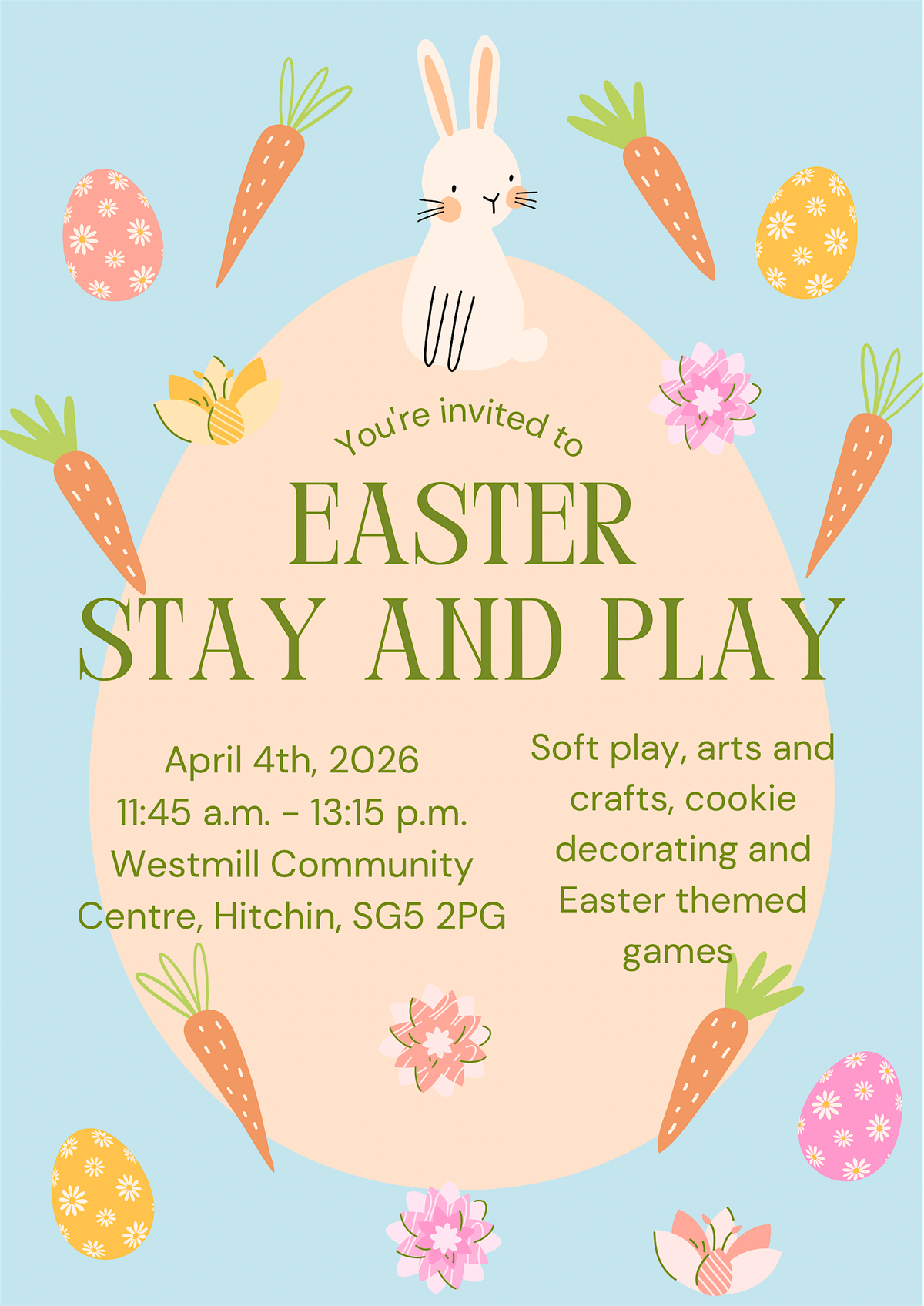 Taking place on the 4th of April, from 11:45am - 13:15pm at Westmill Community Centre, Hitchin, SG5 2PG. It's perfect way to celebrarte Easter with play, creativty and sweet treats. A lovely chance for children to explore, create and burn off some bunny energy! ๐ฐ