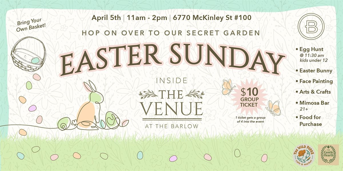 Your $10 ticket is valid for a family/group of 4 (kids under 2 years old are free). Spend the afternoon with us on the lawn, hunting for eggs, sipping mimosas, and having a delicious lunch from Wild Poppy Cafe. πΌ
