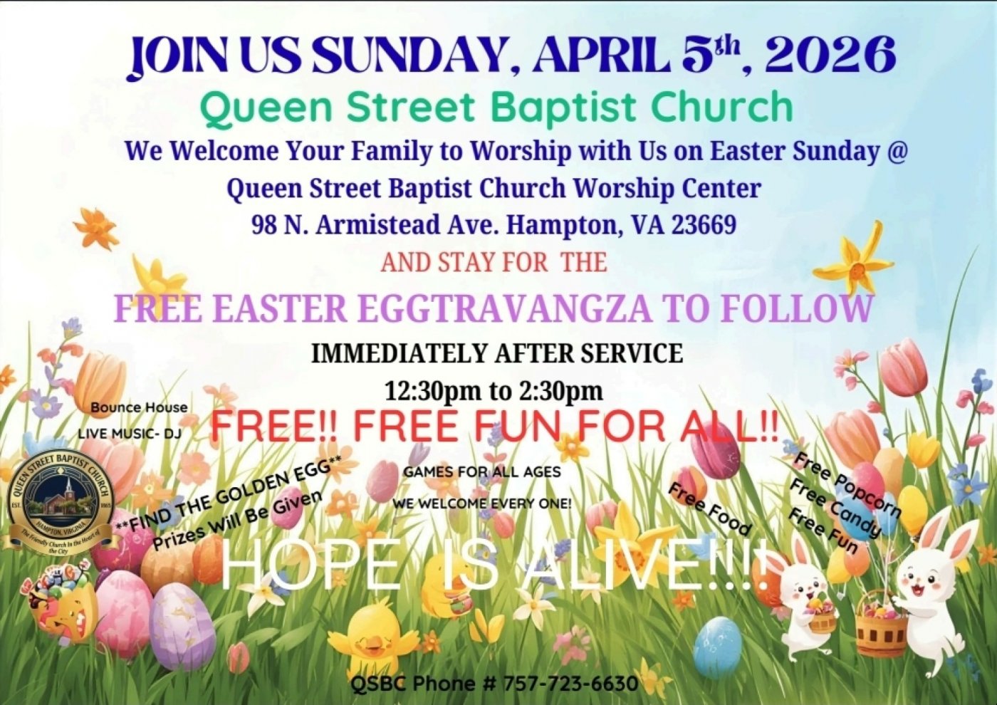 Egg Hunt immediately after the Worship Service on the lawn of Queen Street Baptist Church at 190 W. Queens Way, Hampton, VA 23669 (directly behind the worship center)